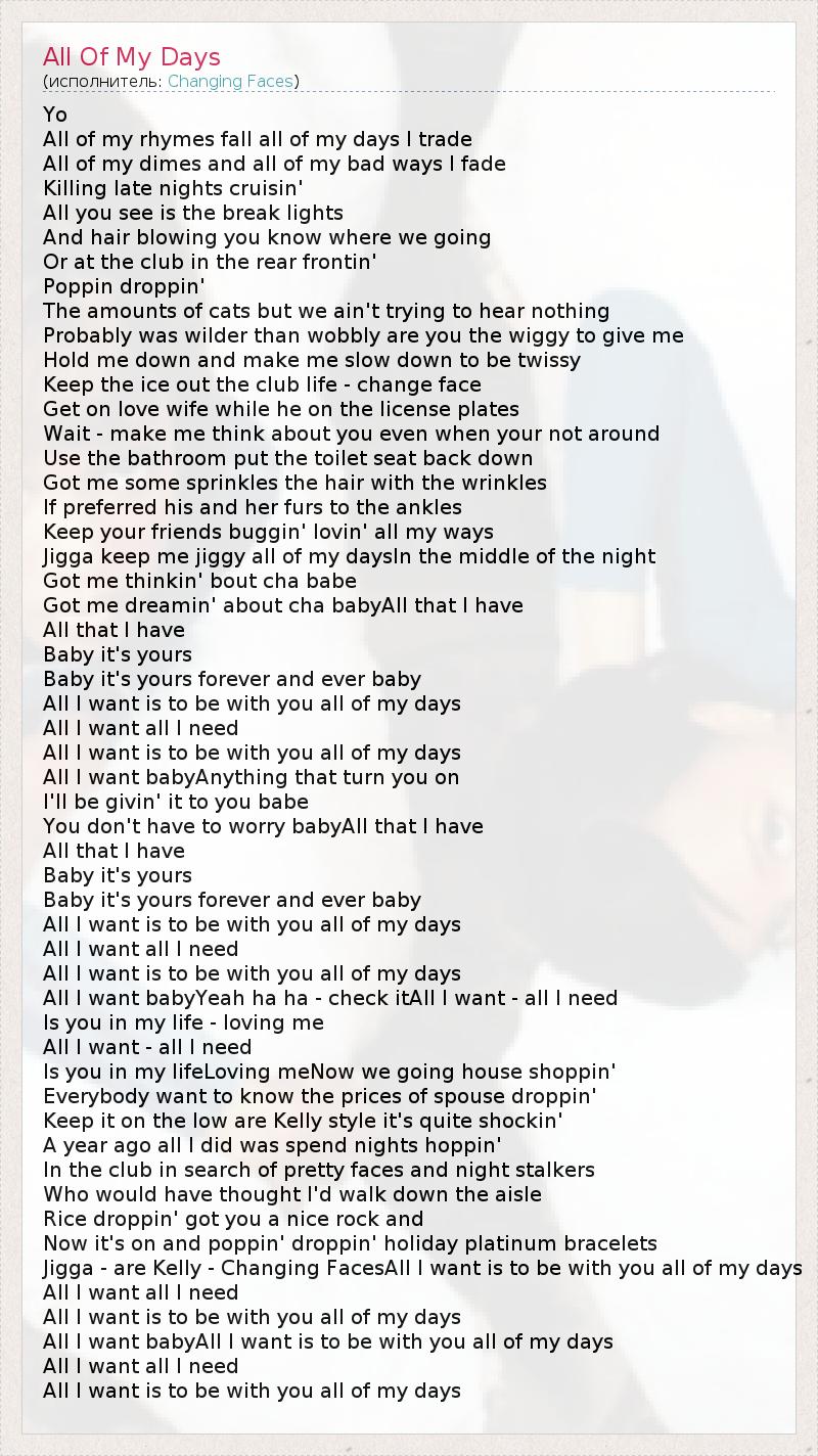 Yo All of my rhymes fall all of my days I trade All of my dimes and all of my bad ways I fade Killing late nights cruisin' All you see is the break lights And hair blowing you know where we going Or at the club in the rear frontin' Poppin droppin' The amounts of cats but we ain't trying to hear nothing Probably was wilder than wobbly are you the wiggy to give me Hold me down and make me slow down to be twissy Keep the ice out the club life - change face Get on love wife while he on the license plates Wait - make me think about you even when your not around Use the bathroom put the toilet seat back down Got me some sprinkles the hair with the wrinkles If preferred his and her furs to the ankles Keep your friends buggin' lovin' all my ways Jigga keep me jiggy all of my daysIn the middle of the night Got me thinkin' bout cha babe Got me dreamin' about cha babyAll that I have All that I have Baby it's yours Baby it's yours forever and ever baby All I want is to be with you all of my days All I want all I need All I want is to be with you all of my days All I want babyAnything that turn you on I'll be givin' it to you babe You don't have to worry babyAll that I have All that I have Baby it's yours Baby it's yours forever and ever baby All I want is to be with you all of my days All I want all I need All I want is to be with you all of my days All I want babyYeah ha ha - check itAll I want - all I need Is you in my life - loving me All I want - all I need Is you in my lifeLoving meNow we going house shoppin' Everybody want to know the prices of spouse droppin' Keep it on the low are Kelly style it's quite shockin' A year ago all I did was spend nights hoppin' In the club in search of pretty faces and night stalkers Who would have thought I'd walk down the aisle Rice droppin' got you a nice rock and Now it's on and poppin' droppin' holiday platinum bracelets Jigga - are Kelly - Changing FacesAll I want is to be with you all of my days All I want all I need All I want is to be with you all of my days All I want babyAll I want is to be with you all of my days All I want all I need All I want is to be with you all of my days