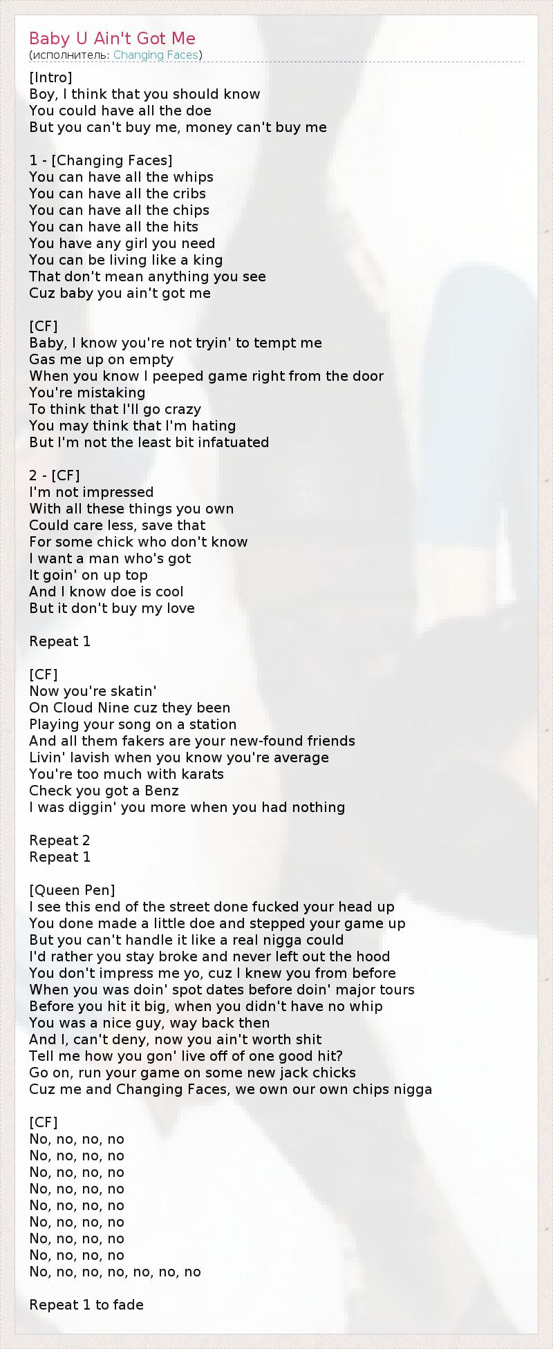 [Intro] Boy, I think that you should know You could have all the doe But you can't buy me, money can't buy me 1 - [Changing Faces] You can have all the whips You can have all the cribs You can have all the chips You can have all the hits You have any girl you need You can be living like a king That don't mean anything you see Cuz baby you ain't got me [CF] Baby, I know you're not tryin' to tempt me Gas me up on empty When you know I peeped game right from the door You're mistaking To think that I'll go crazy You may think that I'm hating But I'm not the least bit infatuated 2 - [CF] I'm not impressed With all these things you own Could care less, save that For some chick who don't know I want a man who's got It goin' on up top And I know doe is cool But it don't buy my love Repeat 1 [CF] Now you're skatin' On Cloud Nine cuz they been Playing your song on a station And all them fakers are your new-found friends Livin' lavish when you know you're average You're too much with karats Check you got a Benz I was diggin' you more when you had nothing Repeat 2 Repeat 1 [Queen Pen] I see this end of the street done fucked your head up You done made a little doe and stepped your game up But you can't handle it like a real nigga could I'd rather you stay broke and never left out the hood You don't impress me yo, cuz I knew you from before When you was doin' spot dates before doin' major tours Before you hit it big, when you didn't have no whip You was a nice guy, way back then And I, can't deny, now you ain't worth shit Tell me how you gon' live off of one good hit? Go on, run your game on some new jack chicks Cuz me and Changing Faces, we own our own chips nigga [CF] No, no, no, no No, no, no, no No, no, no, no No, no, no, no No, no, no, no No, no, no, no No, no, no, no No, no, no, no No, no, no, no, no, no, no Repeat 1 to fade