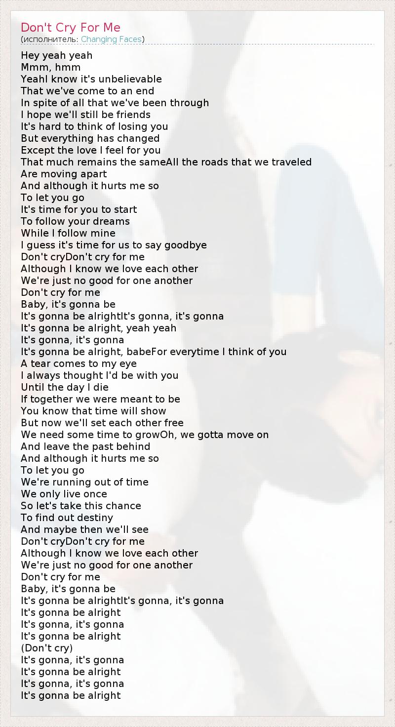 Hey yeah yeah Mmm, hmm YeahI know it's unbelievable That we've come to an end In spite of all that we've been through I hope we'll still be friends It's hard to think of losing you But everything has changed Except the love I feel for you That much remains the sameAll the roads that we traveled Are moving apart And although it hurts me so To let you go It's time for you to start To follow your dreams While I follow mine I guess it's time for us to say goodbye Don't cryDon't cry for me Although I know we love each other We're just no good for one another Don't cry for me Baby, it's gonna be It's gonna be alrightIt's gonna, it's gonna It's gonna be alright, yeah yeah It's gonna, it's gonna It's gonna be alright, babeFor everytime I think of you A tear comes to my eye I always thought I'd be with you Until the day I die If together we were meant to be You know that time will show But now we'll set each other free We need some time to growOh, we gotta move on And leave the past behind And although it hurts me so To let you go We're running out of time We only live once So let's take this chance To find out destiny And maybe then we'll see Don't cryDon't cry for me Although I know we love each other We're just no good for one another Don't cry for me Baby, it's gonna be It's gonna be alrightIt's gonna, it's gonna It's gonna be alright It's gonna, it's gonna It's gonna be alright (Don't cry) It's gonna, it's gonna It's gonna be alright It's gonna, it's gonna It's gonna be alright