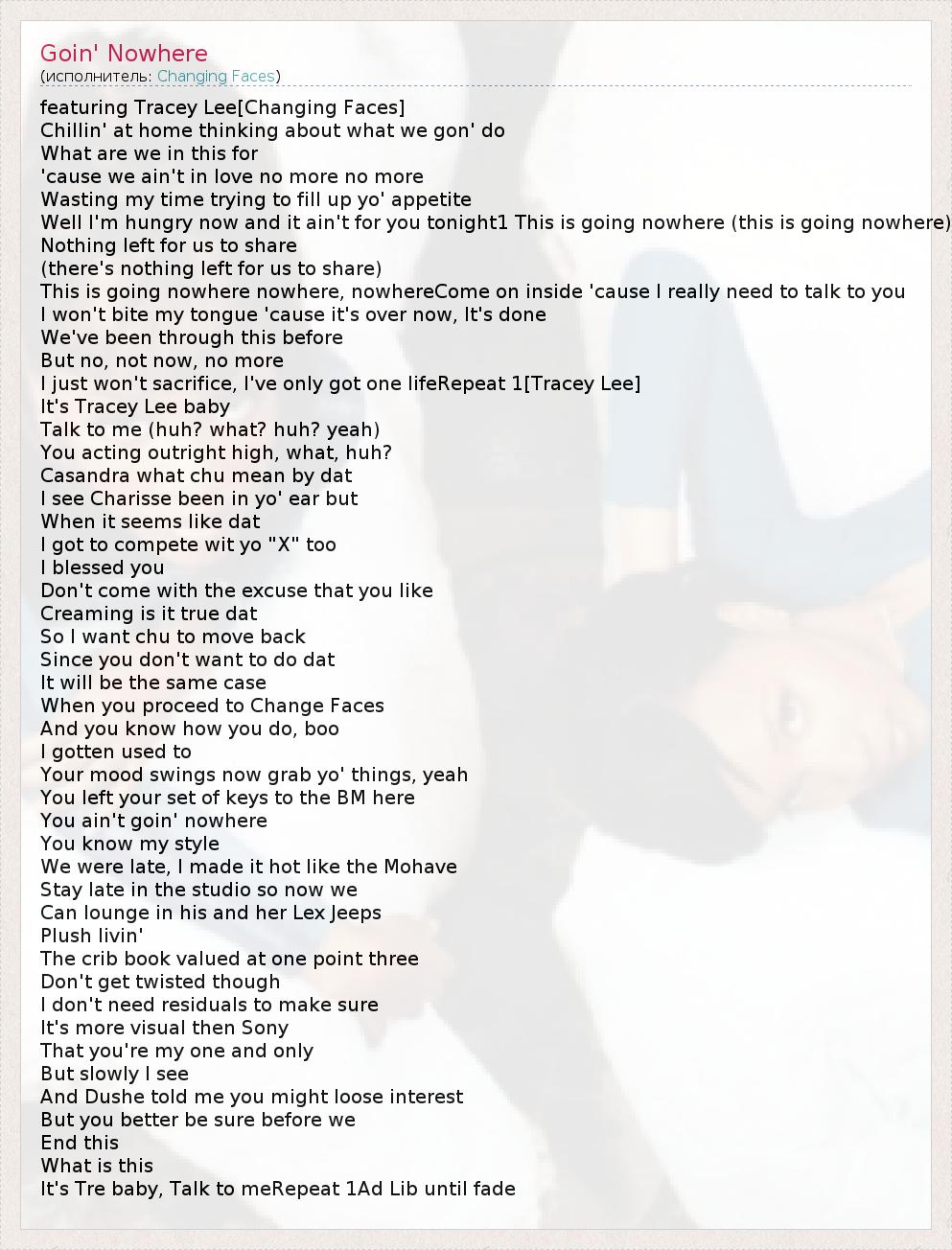 featuring Tracey Lee[Changing Faces] Chillin' at home thinking about what we gon' do What are we in this for 'cause we ain't in love no more no more Wasting my time trying to fill up yo' appetite Well I'm hungry now and it ain't for you tonight1 This is going nowhere (this is going nowhere) Nothing left for us to share (there's nothing left for us to share) This is going nowhere nowhere, nowhereCome on inside 'cause I really need to talk to you I won't bite my tongue 'cause it's over now, It's done We've been through this before But no, not now, no more I just won't sacrifice, I've only got one lifeRepeat 1[Tracey Lee] It's Tracey Lee baby Talk to me (huh? what? huh? yeah) You acting outright high, what, huh? Casandra what chu mean by dat I see Charisse been in yo' ear but When it seems like dat I got to compete wit yo "X" too I blessed you Don't come with the excuse that you like Creaming is it true dat So I want chu to move back Since you don't want to do dat It will be the same case When you proceed to Change Faces And you know how you do, boo I gotten used to Your mood swings now grab yo' things, yeah You left your set of keys to the BM here You ain't goin' nowhere You know my style We were late, I made it hot like the Mohave Stay late in the studio so now we Can lounge in his and her Lex Jeeps Plush livin' The crib book valued at one point three Don't get twisted though I don't need residuals to make sure It's more visual then Sony That you're my one and only But slowly I see And Dushe told me you might loose interest But you better be sure before we End this What is this It's Tre baby, Talk to meRepeat 1Ad Lib until fade
