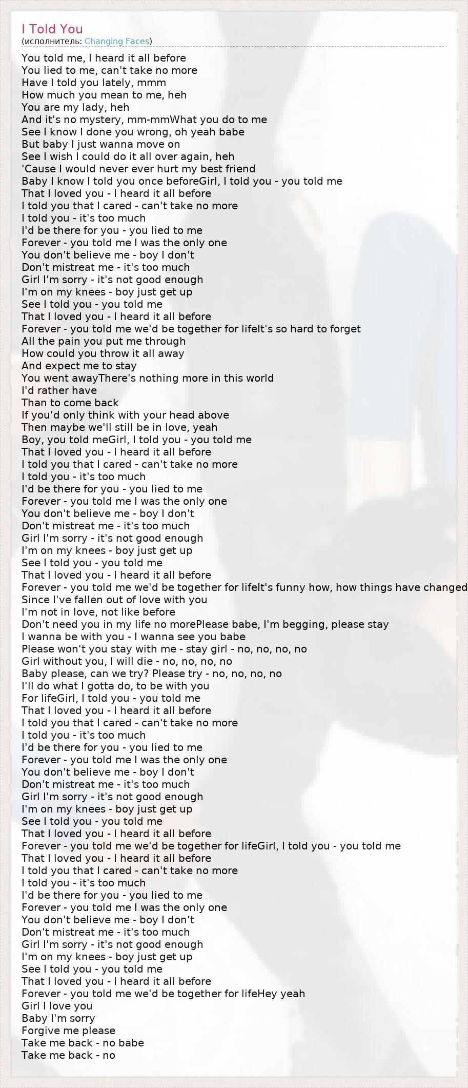You told me, I heard it all before You lied to me, can't take no more Have I told you lately, mmm How much you mean to me, heh You are my lady, heh And it's no mystery, mm-mmWhat you do to me See I know I done you wrong, oh yeah babe But baby I just wanna move on See I wish I could do it all over again, heh 'Cause I would never ever hurt my best friend Baby I know I told you once beforeGirl, I told you - you told me That I loved you - I heard it all before I told you that I cared - can't take no more I told you - it's too much I'd be there for you - you lied to me Forever - you told me I was the only one You don't believe me - boy I don't Don't mistreat me - it's too much Girl I'm sorry - it's not good enough I'm on my knees - boy just get up See I told you - you told me That I loved you - I heard it all before Forever - you told me we'd be together for lifeIt's so hard to forget All the pain you put me through How could you throw it all away And expect me to stay You went awayThere's nothing more in this world I'd rather have Than to come back If you'd only think with your head above Then maybe we'll still be in love, yeah Boy, you told meGirl, I told you - you told me That I loved you - I heard it all before I told you that I cared - can't take no more I told you - it's too much I'd be there for you - you lied to me Forever - you told me I was the only one You don't believe me - boy I don't Don't mistreat me - it's too much Girl I'm sorry - it's not good enough I'm on my knees - boy just get up See I told you - you told me That I loved you - I heard it all before Forever - you told me we'd be together for lifeIt's funny how, how things have changed Since I've fallen out of love with you I'm not in love, not like before Don't need you in my life no morePlease babe, I'm begging, please stay I wanna be with you - I wanna see you babe Please won't you stay with me - stay girl - no, no, no, no Girl without you, I will die - no, no, no, no Baby please, can we try? Please try - no, no, no, no I'll do what I gotta do, to be with you For lifeGirl, I told you - you told me That I loved you - I heard it all before I told you that I cared - can't take no more I told you - it's too much I'd be there for you - you lied to me Forever - you told me I was the only one You don't believe me - boy I don't Don't mistreat me - it's too much Girl I'm sorry - it's not good enough I'm on my knees - boy just get up See I told you - you told me That I loved you - I heard it all before Forever - you told me we'd be together for lifeGirl, I told you - you told me That I loved you - I heard it all before I told you that I cared - can't take no more I told you - it's too much I'd be there for you - you lied to me Forever - you told me I was the only one You don't believe me - boy I don't Don't mistreat me - it's too much Girl I'm sorry - it's not good enough I'm on my knees - boy just get up See I told you - you told me That I loved you - I heard it all before Forever - you told me we'd be together for lifeHey yeah Girl I love you Baby I'm sorry Forgive me please Take me back - no babe Take me back - no