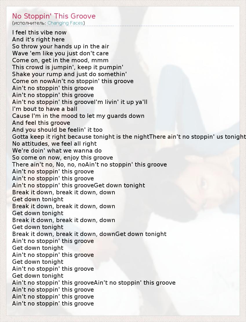 I feel this vibe now And it's right here So throw your hands up in the air Wave 'em like you just don't care Come on, get in the mood, mmm This crowd is jumpin', keep it pumpin' Shake your rump and just do somethin' Come on nowAin't no stoppin' this groove Ain't no stoppin' this groove Ain't no stoppin' this groove Ain't no stoppin' this grooveI'm livin' it up ya'll I'm bout to have a ball Cause I'm in the mood to let my guards down And feel this groove And you should be feelin' it too Gotta keep it right because tonight is the nightThere ain't no stoppin' us tonight No attitudes, we feel all right We're doin' what we wanna do So come on now, enjoy this groove There ain't no, No, no, noAin't no stoppin' this groove Ain't no stoppin' this groove Ain't no stoppin' this groove Ain't no stoppin' this grooveGet down tonight Break it down, break it down, down Get down tonight Break it down, break it down, down Get down tonight Break it down, break it down, down Get down tonight Break it down, break it down, downGet down tonight Ain't no stoppin' this groove Get down tonight Ain't no stoppin' this groove Get down tonight Ain't no stoppin' this groove Get down tonight Ain't no stoppin' this grooveAin't no stoppin' this groove Ain't no stoppin' this groove Ain't no stoppin' this groove Ain't no stoppin' this groove