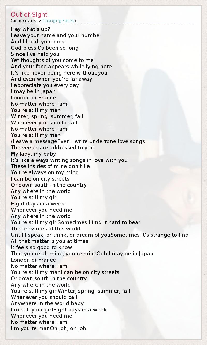 Hey what's up? Leave your name and your number And I'll call you back God blessIt's been so long Since I've held you Yet thoughts of you come to me And your face appears while lying here It's like never being here without you And even when you're far away I appreciate you every day I may be in Japan London or France No matter where I am You're still my man Winter, spring, summer, fall Whenever you should call No matter where I am You're still my man (Leave a messageEven I write undertone love songs The verses are addressed to you My lady, my baby It's like always writing songs in love with you These insides of mine don't lie You're always on my mind I can be on city streets Or down south in the country Any where in the world You're still my girl Eight days in a week Whenever you need me Any where in the world You're still my girlSometimes I find it hard to bear The pressures of this world Until I speak, or think, or dream of youSometimes it's strange to find All that matter is you at times It feels so good to know That you're all mine, you're mineOoh I may be in Japan London or France No matter where I am You're still my manI can be on city streets Or down south in the country Any where in the world You're still my girlWinter, spring, summer, fall Whenever you should call Anywhere in the world baby I'm still your girlEight days in a week Whenever you need me No matter where I am I'm you're manOh, oh, oh, oh
