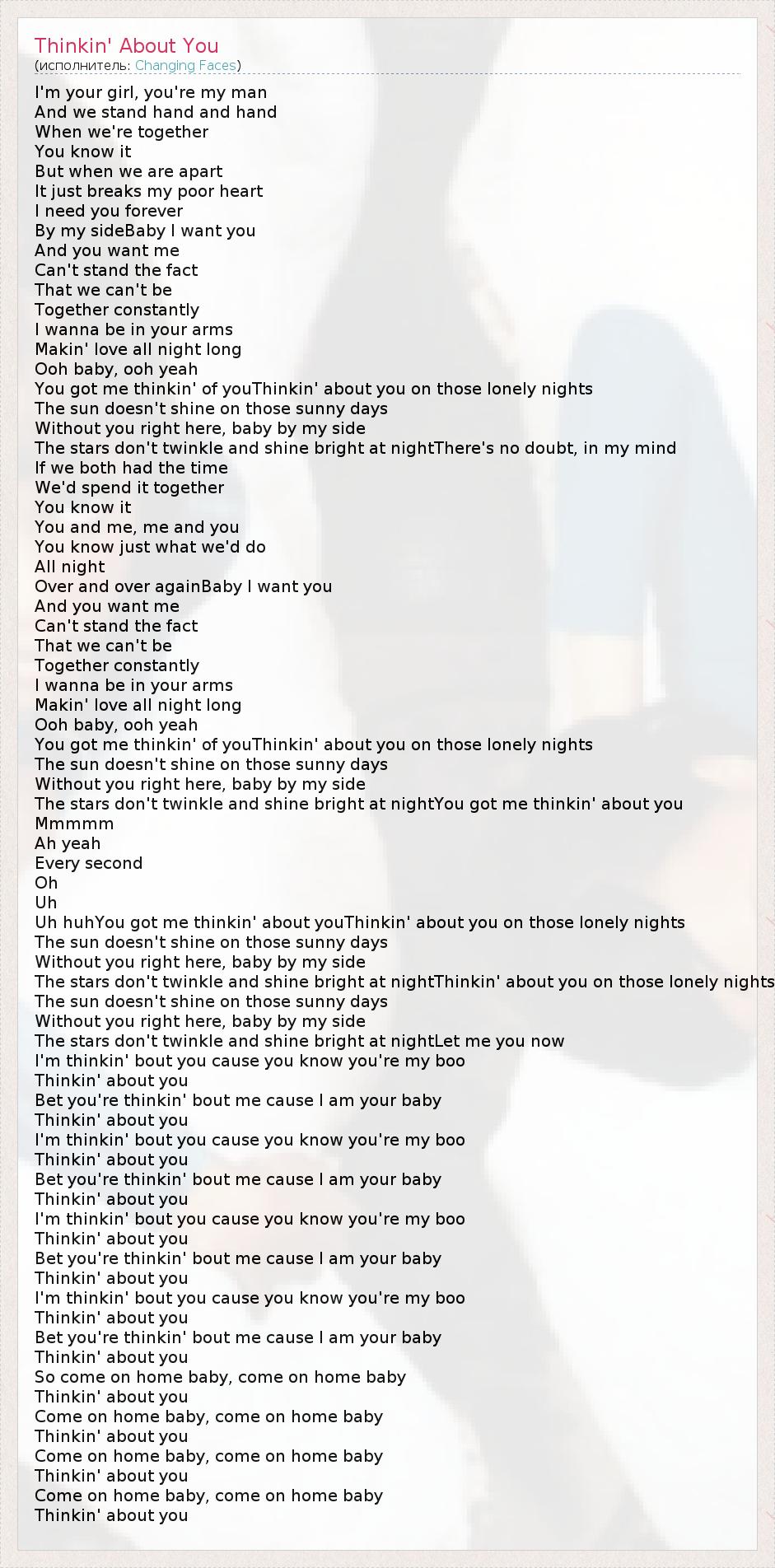 I'm your girl, you're my man And we stand hand and hand When we're together You know it But when we are apart It just breaks my poor heart I need you forever By my sideBaby I want you And you want me Can't stand the fact That we can't be Together constantly I wanna be in your arms Makin' love all night long Ooh baby, ooh yeah You got me thinkin' of youThinkin' about you on those lonely nights The sun doesn't shine on those sunny days Without you right here, baby by my side The stars don't twinkle and shine bright at nightThere's no doubt, in my mind If we both had the time We'd spend it together You know it You and me, me and you You know just what we'd do All night Over and over againBaby I want you And you want me Can't stand the fact That we can't be Together constantly I wanna be in your arms Makin' love all night long Ooh baby, ooh yeah You got me thinkin' of youThinkin' about you on those lonely nights The sun doesn't shine on those sunny days Without you right here, baby by my side The stars don't twinkle and shine bright at nightYou got me thinkin' about you Mmmmm Ah yeah Every second Oh Uh Uh huhYou got me thinkin' about youThinkin' about you on those lonely nights The sun doesn't shine on those sunny days Without you right here, baby by my side The stars don't twinkle and shine bright at nightThinkin' about you on those lonely nights The sun doesn't shine on those sunny days Without you right here, baby by my side The stars don't twinkle and shine bright at nightLet me you now I'm thinkin' bout you cause you know you're my boo Thinkin' about you Bet you're thinkin' bout me cause I am your baby Thinkin' about you I'm thinkin' bout you cause you know you're my boo Thinkin' about you Bet you're thinkin' bout me cause I am your baby Thinkin' about you I'm thinkin' bout you cause you know you're my boo Thinkin' about you Bet you're thinkin' bout me cause I am your baby Thinkin' about you I'm thinkin' bout you cause you know you're my boo Thinkin' about you Bet you're thinkin' bout me cause I am your baby Thinkin' about you So come on home baby, come on home baby Thinkin' about you Come on home baby, come on home baby Thinkin' about you Come on home baby, come on home baby Thinkin' about you Come on home baby, come on home baby Thinkin' about you