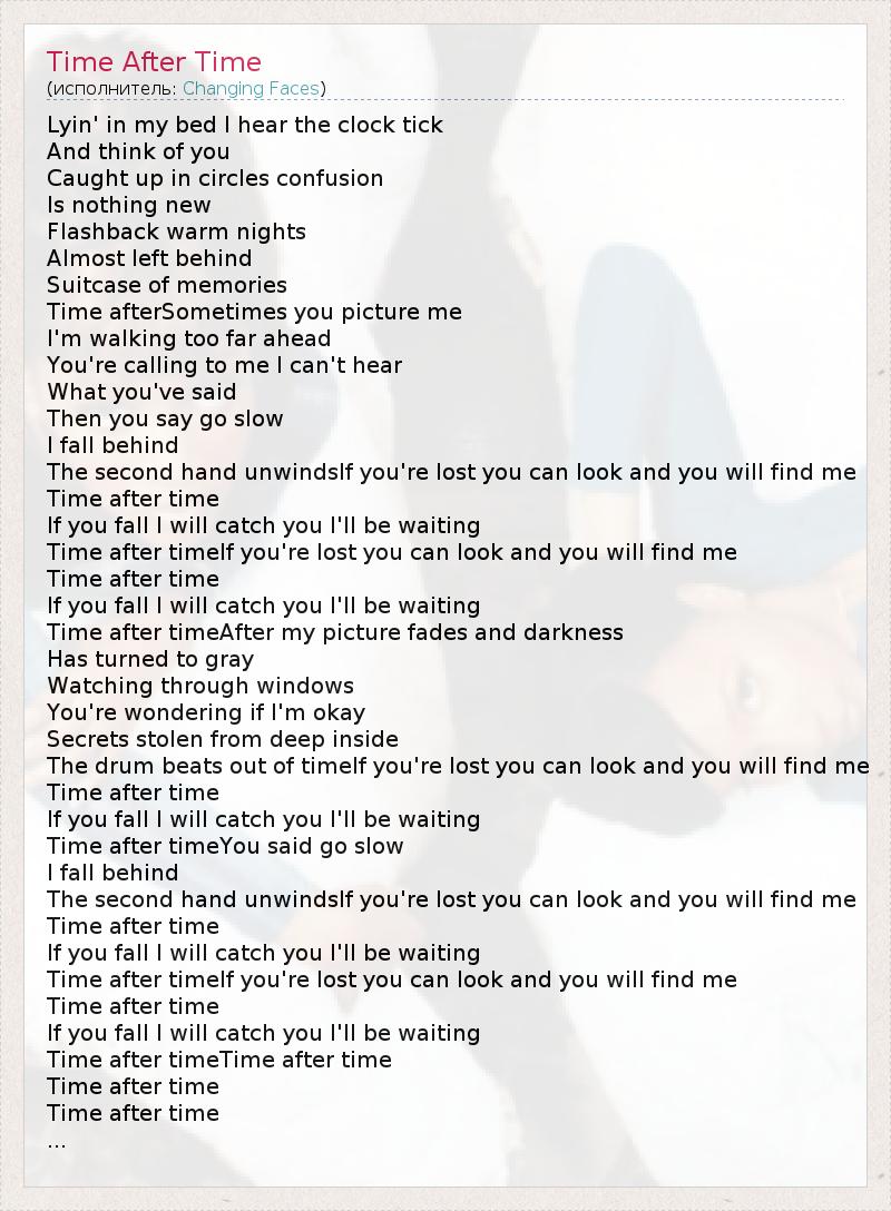 Lyin' in my bed I hear the clock tick And think of you Caught up in circles confusion Is nothing new Flashback warm nights Almost left behind Suitcase of memories Time afterSometimes you picture me I'm walking too far ahead You're calling to me I can't hear What you've said Then you say go slow I fall behind The second hand unwindsIf you're lost you can look and you will find me Time after time If you fall I will catch you I'll be waiting Time after timeIf you're lost you can look and you will find me Time after time If you fall I will catch you I'll be waiting Time after timeAfter my picture fades and darkness Has turned to gray Watching through windows You're wondering if I'm okay Secrets stolen from deep inside The drum beats out of timeIf you're lost you can look and you will find me Time after time If you fall I will catch you I'll be waiting Time after timeYou said go slow I fall behind The second hand unwindsIf you're lost you can look and you will find me Time after time If you fall I will catch you I'll be waiting Time after timeIf you're lost you can look and you will find me Time after time If you fall I will catch you I'll be waiting Time after timeTime after time Time after time Time after time ...