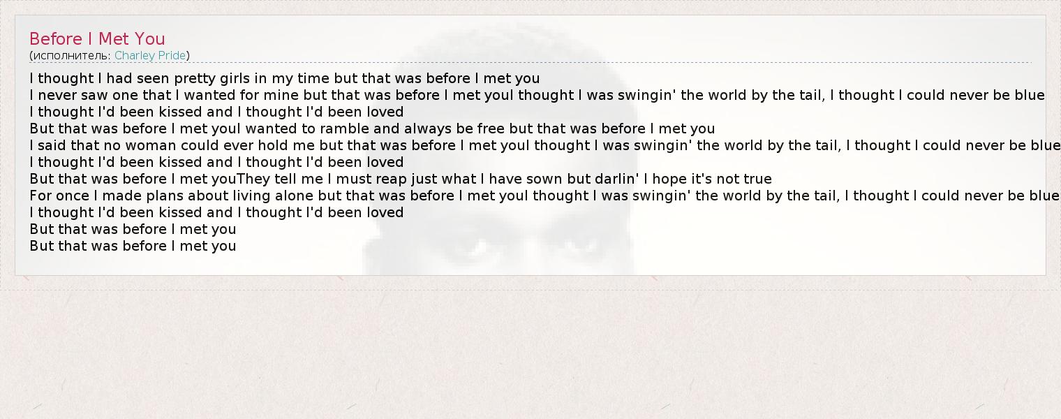 I said that no woman could ever hold me but that was before I met youI thought I was swingin' the world by the tail, I thought I could never be blue