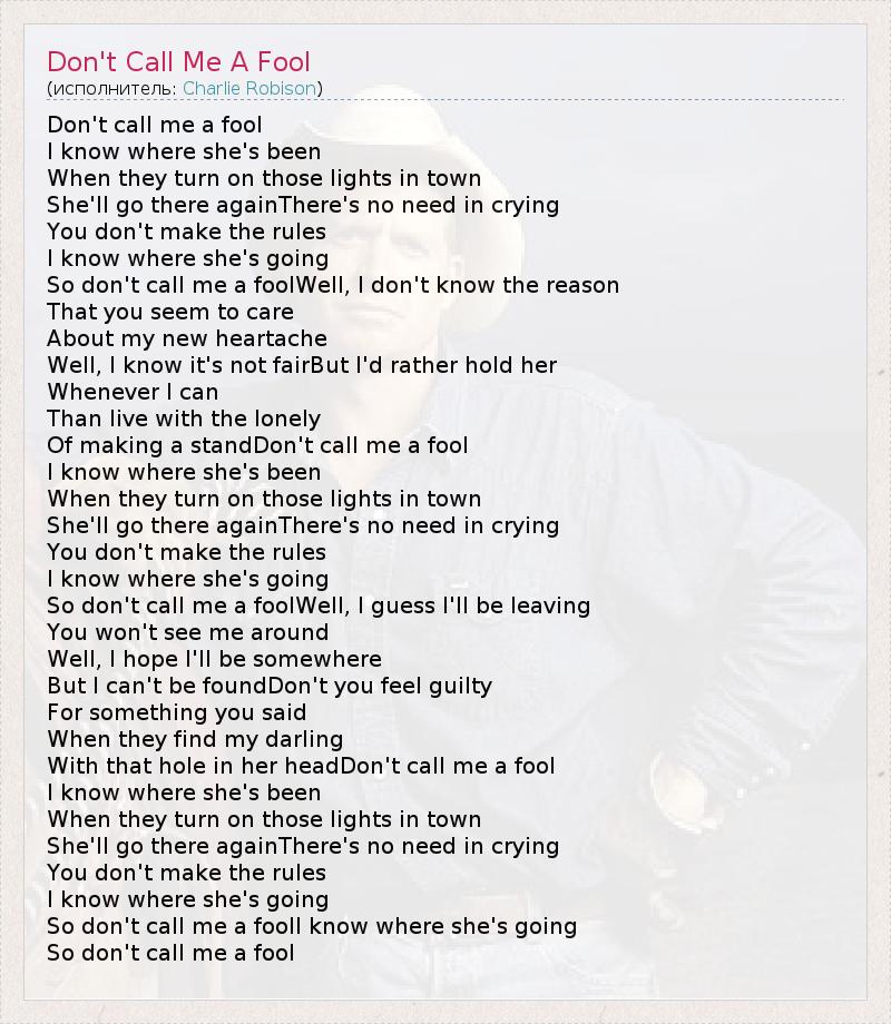 Don't call me a fool I know where she's been When they turn on those lights in town She'll go there againThere's no need in crying You don't make the rules I know where she's going So don't call me a foolWell, I don't know the reason That you seem to care About my new heartache Well, I know it's not fairBut I'd rather hold her Whenever I can Than live with the lonely Of making a standDon't call me a fool I know where she's been When they turn on those lights in town She'll go there againThere's no need in crying You don't make the rules I know where she's going So don't call me a foolWell, I guess I'll be leaving You won't see me around Well, I hope I'll be somewhere But I can't be foundDon't you feel guilty For something you said When they find my darling With that hole in her headDon't call me a fool I know where she's been When they turn on those lights in town She'll go there againThere's no need in crying You don't make the rules I know where she's going So don't call me a foolI know where she's going So don't call me a fool