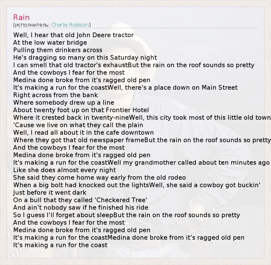 Well, I hear that old John Deere tractor At the low water bridge Pulling them drinkers across He's dragging so many on this Saturday night I can smell that old tractor's exhaustBut the rain on the roof sounds so pretty And the cowboys I fear for the most Medina done broke from it's ragged old pen It's making a run for the coastWell, there's a place down on Main Street Right across from the bank Where somebody drew up a line About twenty foot up on that Frontier Hotel Where it crested back in twenty-nineWell, this city took most of this little old town 'Cause we live on what they call the plain Well, I read all about it in the cafe downtown Where they got that old newspaper frameBut the rain on the roof sounds so pretty And the cowboys I fear for the most Medina done broke from it's ragged old pen It's making a run for the coastWell my grandmother called about ten minutes ago Like she does almost every night She said they come home way early from the old rodeo When a big bolt had knocked out the lightsWell, she said a cowboy got buckin' Just before it went dark On a bull that they called 'Checkered Tree' And ain't nobody saw if he finished his ride So I guess I'll forget about sleepBut the rain on the roof sounds so pretty And the cowboys I fear for the most Medina done broke from it's ragged old pen It's making a run for the coastMedina done broke from it's ragged old pen It's making a run for the coast