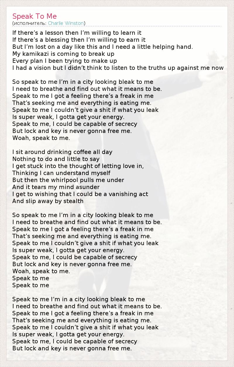 If there’s a lesson then I’m willing to learn it If there’s a blessing then I’m willing to earn it But I’m lost on a day like this and I need a little helping hand. My kamikazi is coming to break up Every plan I been trying to make up I had a vision but I didn’t think to listen to the truths up against me now So speak to me I’m in a city looking bleak to me I need to breathe and find out what it means to be. Speak to me I got a feeling there’s a freak in me That’s seeking me and everything is eating me. Speak to me I couldn’t give a shit if what you leak Is super weak, I gotta get your energy. Speak to me, I could be capable of secrecy But lock and key is never gonna free me. Woah, speak to me. I sit around drinking coffee all day Nothing to do and little to say I get stuck into the thought of letting love in, Thinking I can understand myself But then the whirlpool pulls me under And it tears my mind asunder I get to wishing that I could be a vanishing act And slip away by stealth So speak to me I’m in a city looking bleak to me I need to breathe and find out what it means to be. Speak to me I got a feeling there’s a freak in me That’s seeking me and everything is eating me. Speak to me I couldn’t give a shit if what you leak Is super weak, I gotta get your energy. Speak to me, I could be capable of secrecy But lock and key is never gonna free me. Woah, speak to me. Speak to me Speak to me Speak to me I’m in a city looking bleak to me I need to breathe and find out what it means to be. Speak to me I got a feeling there’s a freak in me That’s seeking me and everything is eating me. Speak to me I couldn’t give a shit if what you leak Is super weak, I gotta get your energy. Speak to me, I could be capable of secrecy But lock and key is never gonna free me.