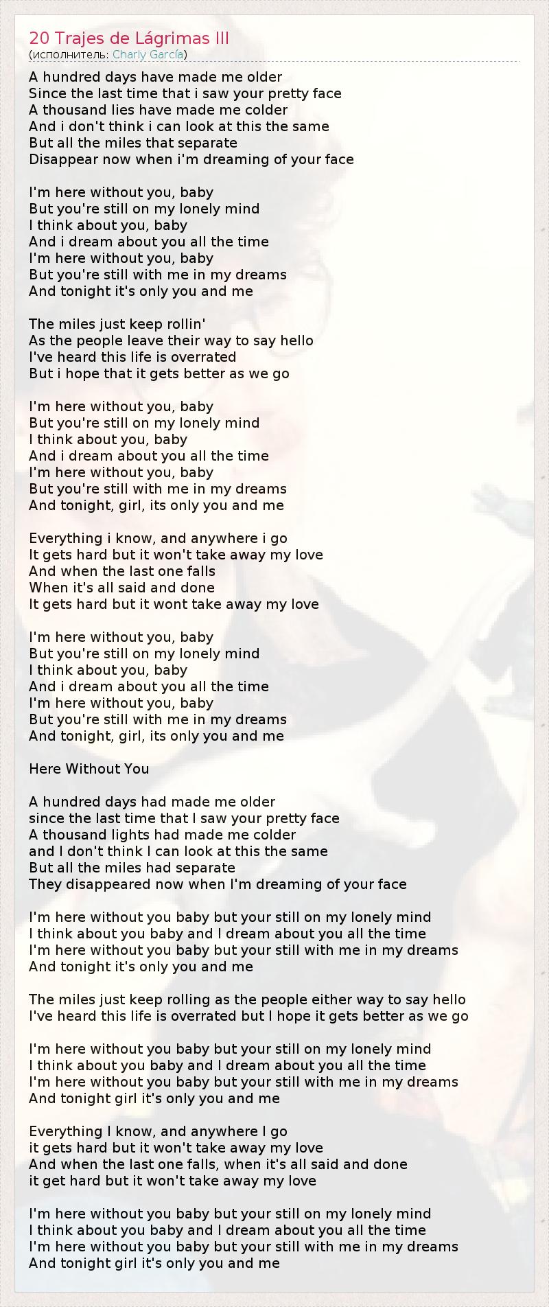 A hundred days have made me older Since the last time that i saw your pretty face A thousand lies have made me colder And i don't think i can look at this the same But all the miles that separate Disappear now when i'm dreaming of your face I'm here without you, baby But you're still on my lonely mind I think about you, baby And i dream about you all the time I'm here without you, baby But you're still with me in my dreams And tonight it's only you and me The miles just keep rollin' As the people leave their way to say hello I've heard this life is overrated But i hope that it gets better as we go I'm here without you, baby But you're still on my lonely mind I think about you, baby And i dream about you all the time I'm here without you, baby But you're still with me in my dreams And tonight, girl, its only you and me Everything i know, and anywhere i go It gets hard but it won't take away my love And when the last one falls When it's all said and done It gets hard but it wont take away my love I'm here without you, baby But you're still on my lonely mind I think about you, baby And i dream about you all the time I'm here without you, baby But you're still with me in my dreams And tonight, girl, its only you and me Here Without You A hundred days had made me older since the last time that I saw your pretty face A thousand lights had made me colder and I don't think I can look at this the same But all the miles had separate They disappeared now when I'm dreaming of your face I'm here without you baby but your still on my lonely mind I think about you baby and I dream about you all the time I'm here without you baby but your still with me in my dreams And tonight it's only you and me The miles just keep rolling as the people either way to say hello I've heard this life is overrated but I hope it gets better as we go I'm here without you baby but your still on my lonely mind I think about you baby and I dream about you all the time I'm here without you baby but your still with me in my dreams And tonight girl it's only you and me Everything I know, and anywhere I go it gets hard but it won't take away my love And when the last one falls, when it's all said and done it get hard but it won't take away my love I'm here without you baby but your still on my lonely mind I think about you baby and I dream about you all the time I'm here without you baby but your still with me in my dreams And tonight girl it's only you and me