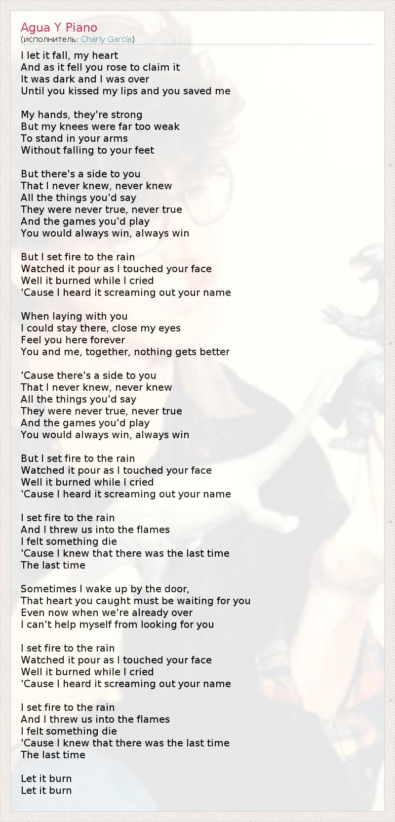 I let it fall, my heart And as it fell you rose to claim it It was dark and I was over Until you kissed mу lips and you saved me My hands, they're strong But my knees were far too weak To stand in your arms Without falling to your feet But there's a side to you That I never knew, never knew All the things you'd say They were never true, never true And the games you'd play You would always win, always win But I set fire to the rain Watched it pour as I touched your face Well it burned while I cried 'Cause I heard it screaming out your name When laying with you I could stay there, close my eyes Feel you here forever You and me, together, nothing gets better 'Cause there's a side to you That I never knew, never knew All the things you'd say They were never true, never true And the games you'd play You would always win, always win But I set fire to the rain Watched it pour as I touched your face Well it burned while I cried 'Cause I heard it screaming out your name I set fire to the rain And I threw us into the flames I felt something die 'Cause I knew that there was the last time The last time Sometimes I wake up by the door, That heart you caught must be waiting for you Even now when we're already over I can't help myself from looking for you I set fire to the rain Watched it pour as I touched your face Well it burned while I cried 'Cause I heard it screaming out your name I set fire to the rain And I threw us into the flames I felt something die 'Cause I knew that there was the last time The last time Let it burn Let it burn