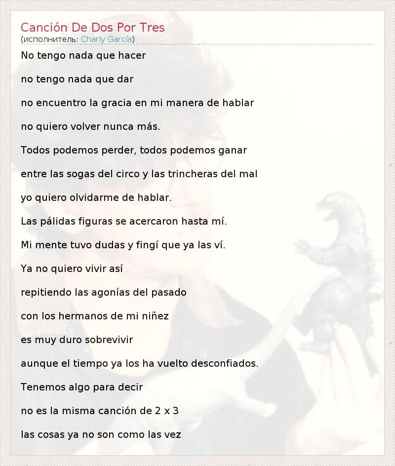 No tengo nada que hacer no tengo nada que dar no encuentro la gracia en mi manera de hablar no quiero volver nunca más. Todos podemos perder, todos podemos ganar entre las sogas del circo y las trincheras del mal yo quiero olvidarme de hablar. Las pálidas figuras se acercaron hasta mí. Mi mente tuvo dudas y fingí que ya las ví. Ya no quiero vivir así repitiendo las agonías del pasado con los hermanos de mi niñez es muy duro sobrevivir aunque el tiempo ya los ha vuelto desconfiados. Tenemos algo para decir no es la misma canción de 2 x 3 las cosas ya no son como las vez