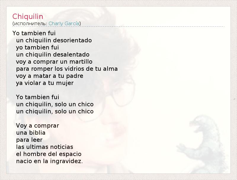 Yo tambien fui un chiquilin desorientado yo tambien fui un chiquilin desalentado voy a comprar un martillo para romper los vidrios de tu alma voy a matar a tu padre ya violar a tu mujer Yo tambien fui un chiquilin, solo un chico un chiquilin, solo un chico Voy a comprar una biblia para leer las ultimas noticias el hombre del espacio nacio en la ingravidez.
