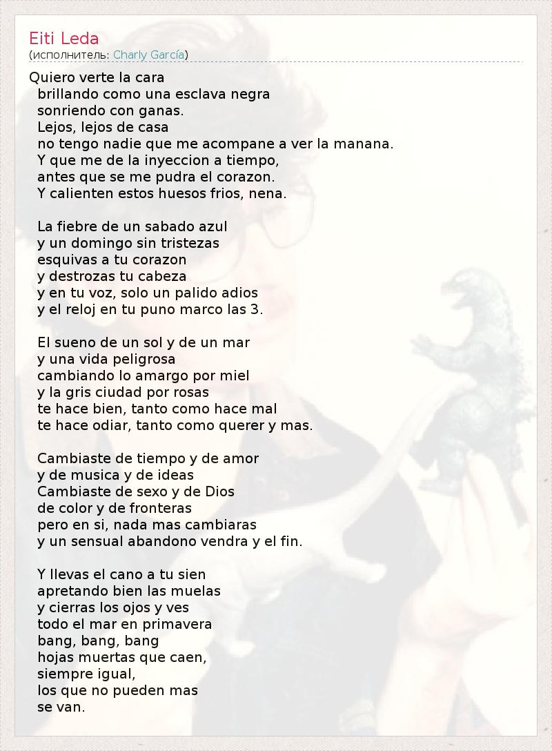 Quiero verte la cara brillando como una esclava negra sonriendo con ganas. Lejos, lejos de casa no tengo nadie que me acompane a ver la manana. Y que me de la inyeccion a tiempo, antes que se me pudra el corazon. Y calienten estos huesos frios, nena. La fiebre de un sabado azul y un domingo sin tristezas esquivas a tu corazon y destrozas tu cabeza y en tu voz, solo un palido adios y el reloj en tu puno marco las 3. El sueno de un sol y de un mar y una vida peligrosa cambiando lo amargo por miel y la gris ciudad por rosas te hace bien, tanto como hace mal te hace odiar, tanto como querer y mas. Cambiaste de tiempo y de amor y de musica y de ideas Cambiaste de sexo y de Dios de color y de fronteras pero en si, nada mas cambiaras y un sensual abandono vendra y el fin. Y llevas el cano a tu sien apretando bien las muelas y cierras los ojos y ves todo el mar en primavera bang, bang, bang hojas muertas que caen, siempre igual, los que no pueden mas se van.