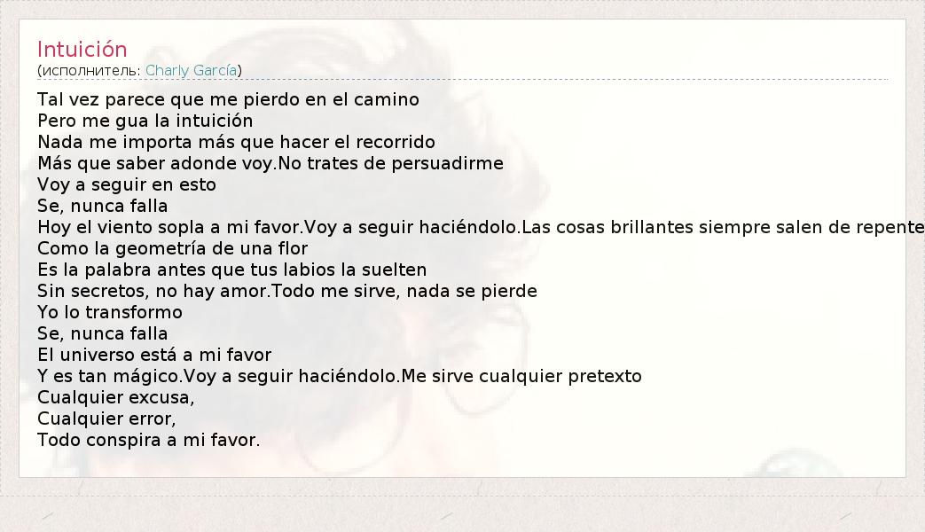 Tal vez parece que me pierdo en el camino Pero me gua la intuición Nada me importa más que hacer el recorrido Más que saber adonde voy.No trates de persuadirme Voy a seguir en esto Se, nunca falla Hoy el viento sopla a mi favor.Voy a seguir haciéndolo.Las cosas brillantes siempre salen de repente Como la geometría de una flor Es la palabra antes que tus labios la suelten Sin secretos, no hay amor.Todo me sirve, nada se pierde Yo lo transformo Se, nunca falla El universo está a mi favor Y es tan mágico.Voy a seguir haciéndolo.Me sirve cualquier pretexto Cualquier excusa, Cualquier error, Todo conspira a mi favor.