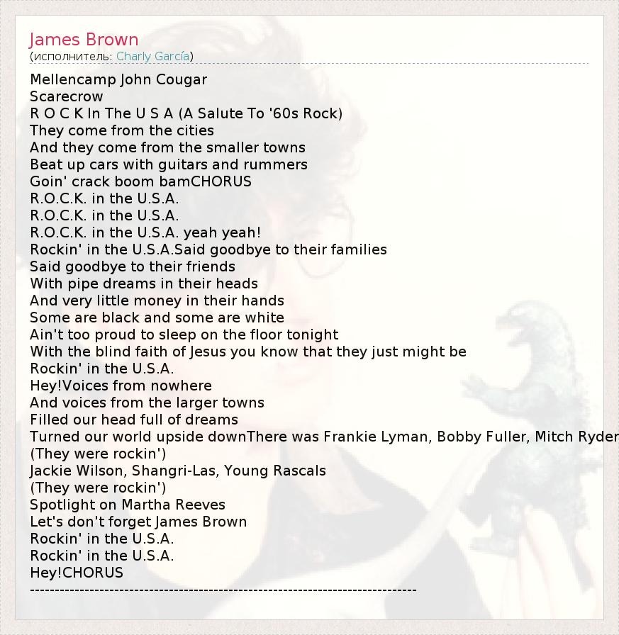 Mellencamp John Cougar Scarecrow R O C K In The U S A (A Salute To '60s Rock) They come from the cities And they come from the smaller towns Beat up cars with guitars and rummers Goin' crack boom bamCHORUS R.O.C.K. in the U.S.A. R.O.C.K. in the U.S.A. R.O.C.K. in the U.S.A. yeah yeah! Rockin' in the U.S.A.Said goodbye to their families Said goodbye to their friends With pipe dreams in their heads And very little money in their hands Some are black and some are white Ain't too proud to sleep on the floor tonight With the blind faith of Jesus you know that they just might be Rockin' in the U.S.A. Hey!Voices from nowhere And voices from the larger towns Filled our head full of dreams Turned our world upside downThere was Frankie Lyman, Bobby Fuller, Mitch Ryder (They were rockin') Jackie Wilson, Shangri-Las, Young Rascals (They were rockin') Spotlight on Martha Reeves Let's don't forget James Brown Rockin' in the U.S.A. Rockin' in the U.S.A. Hey!CHORUS ------------------------------------------------------------------------------