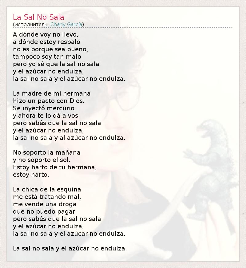 A dónde voy no llevo, a dónde estoy resbalo no es porque sea bueno, tampoco soy tan malo pero yo sé que la sal no sala y el azúcar no endulza, la sal no sala y el azúcar no endulza. La madre de mi hermana hizo un pacto con Dios. Se inyectó mercurio y ahora te lo dá a vos pero sabés que la sal no sala y el azúcar no endulza, la sal no sala y al azúcar no endulza. No soporto la mañana y no soporto el sol. Estoy harto de tu hermana, estoy harto. La chica de la esquina me está tratando mal, me vende una droga que no puedo pagar pero sabés que la sal no sala y el azúcar no endulza, la sal no sala y el azúcar no endulza. La sal no sala y el azúcar no endulza.