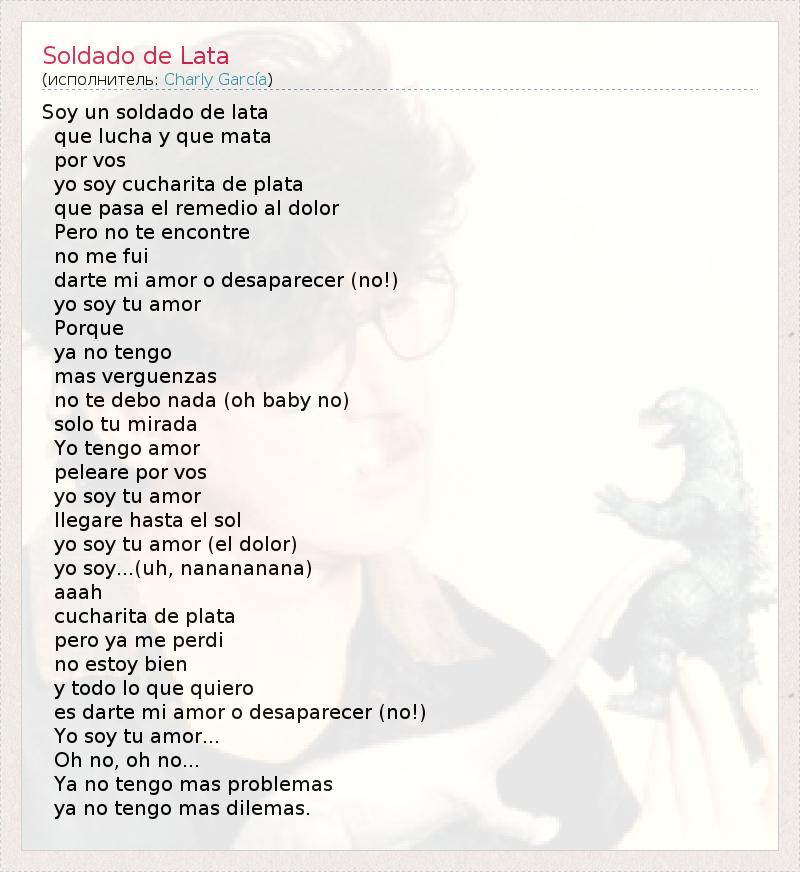 Soy un soldado de lata que lucha y que mata por vos yo soy cucharita de plata que pasa el remedio al dolor Pero no te encontre no me fui darte mi amor o desaparecer (no!) yo soy tu amor Porque ya no tengo mas verguenzas no te debo nada (oh baby no) solo tu mirada Yo tengo amor peleare por vos yo soy tu amor llegare hasta el sol yo soy tu amor (el dolor) yo soy...(uh, nanananana) aaah cucharita de plata pero ya me perdi no estoy bien y todo lo que quiero es darte mi amor o desaparecer (no!) Yo soy tu amor... Oh no, oh no... Ya no tengo mas problemas ya no tengo mas dilemas.
