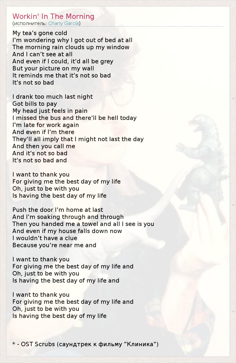 My tea's gone cold I'm wondering why I got out of bed at all The morning rain clouds up my window And I can't see at all And even if I could, it'd all be grey But your picture on my wall It reminds me that it's not so bad It's not so bad I drank too much last night Got bills to pay My head just feels in pain I missed the bus and there'll be hell today I'm late for work again And even if I'm there They'll all imply that I might not last the day And then you call me And it's not so bad It's not so bad and I want to thank you For giving me the best day of my life Oh, just to be with you Is having the best day of my life Push the door I'm home at last And I'm soaking through and through Then you handed me a towel and all I see is you And even if my house falls down now I wouldn't have a clue Because you're near me and I want to thank you For giving me the best day of my life and Oh, just to be with you Is having the best day of my life and I want to thank you For giving me the best day of my life and Oh, just to be with you Is having the best day of my life * - OST Scrubs (саундтрек к фильму "Клиника")