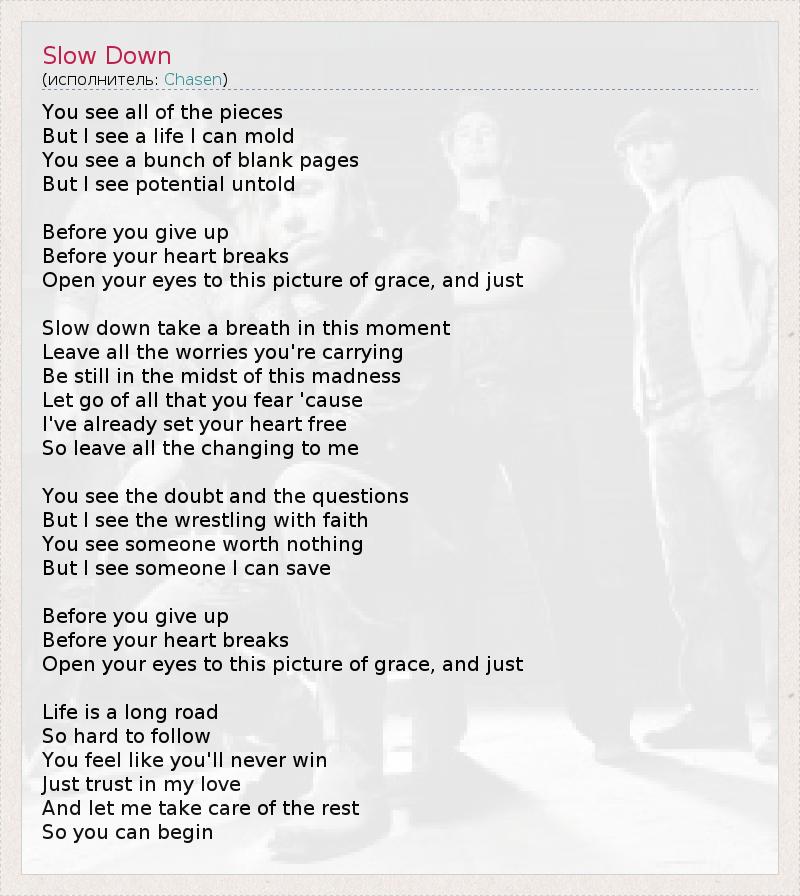 You see all of the pieces But I see a life I can mold You see a bunch of blank pages But I see potential untold Before you give up Before your heart breaks Open your eyes to this picture of grace, and just Slow down take a breath in this moment Leave all the worries you're carrying Be still in the midst of this madness Let go of all that you fear 'cause I've already set your heart free So leave all the changing to me You see the doubt and the questions But I see the wrestling with faith You see someone worth nothing But I see someone I can save Before you give up Before your heart breaks Open your eyes to this picture of grace, and just Life is a long road So hard to follow You feel like you'll never win Just trust in my love And let me take care of the rest So you can begin