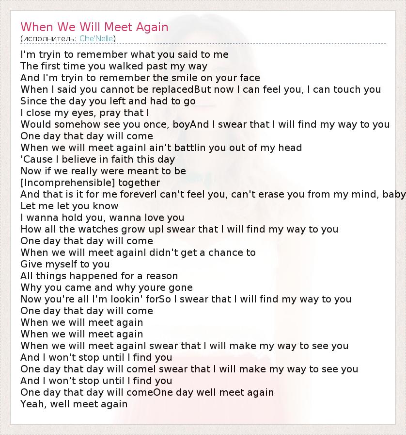I'm tryin to remember what you said to me The first time you walked past my way And I'm tryin to remember the smile on your face When I said you cannot be replacedBut now I can feel you, I can touch you Since the day you left and had to go I close my eyes, pray that I Would somehow see you once, boyAnd I swear that I will find my way to you One day that day will come When we will meet againI ain't battlin you out of my head 'Cause I believe in faith this day Now if we really were meant to be [Incomprehensible] together And that is it for me foreverI can't feel you, can't erase you from my mind, baby Let me let you know I wanna hold you, wanna love you How all the watches grow upI swear that I will find my way to you One day that day will come When we will meet againI didn't get a chance to Give myself to you All things happened for a reason Why you came and why youre gone Now you're all I'm lookin' forSo I swear that I will find my way to you One day that day will come When we will meet again When we will meet again When we will meet againI swear that I will make my way to see you And I won't stop until I find you One day that day will comeI swear that I will make my way to see you And I won't stop until I find you One day that day will comeOne day well meet again Yeah, well meet again