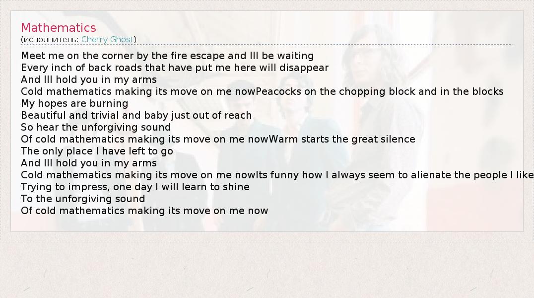 Это интересно:Cherry Ghost is a British indie rock band led by Simon Aldred. They formed in Bolton in 2005 and currently enjoy considerable airplay on BBC Radio 2. Their debut album, Thirst For Romance, entered the UK album charts at #7.The band have supported Amy Winehouse, Crowded House, Polytechnic, Fields, The Spinto Band, and more recently announced Manic Street Preachers on tour.(glam-rock-lover.livejournal.com)