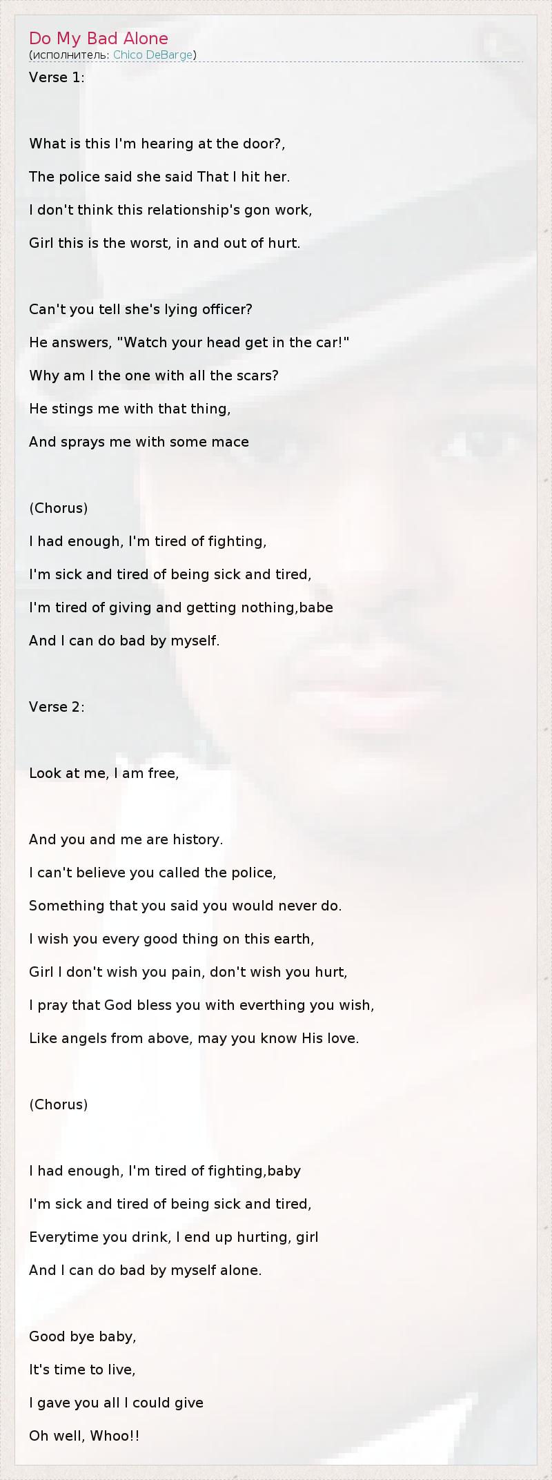 Verse 1: What is this I'm hearing at the door?, The police said she said That I hit her. I don't think this relationship's gon work, Girl this is the worst, in and out of hurt. Can't you tell she's lying officer? He answers, "Watch your head get in the car!" Why am I the one with all the scars? He stings me with that thing, And sprays me with some mace (Chorus) I had enough, I'm tired of fighting, I'm sick and tired of being sick and tired, I'm tired of giving and getting nothing,babe And I can do bad by myself. Verse 2: Look at me, I am free, And you and me are history. I can't believe you called the police, Something that you said you would never do. I wish you every good thing on this earth, Girl I don't wish you pain, don't wish you hurt, I pray that God bless you with everthing you wish, Like angels from above, may you know His love. (Chorus) I had enough, I'm tired of fighting,baby I'm sick and tired of being sick and tired, Everytime you drink, I end up hurting, girl And I can do bad by myself alone. Good bye baby, It's time to live, I gave you all I could give Oh well, Whoo!!