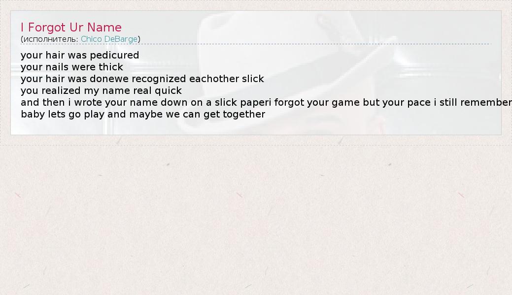your hair was pedicured your nails were thick your hair was donewe recognized eachother slick you realized my name real quick and then i wrote your name down on a slick paperi forgot your game but your pace i still remember baby lets go play and maybe we can get together