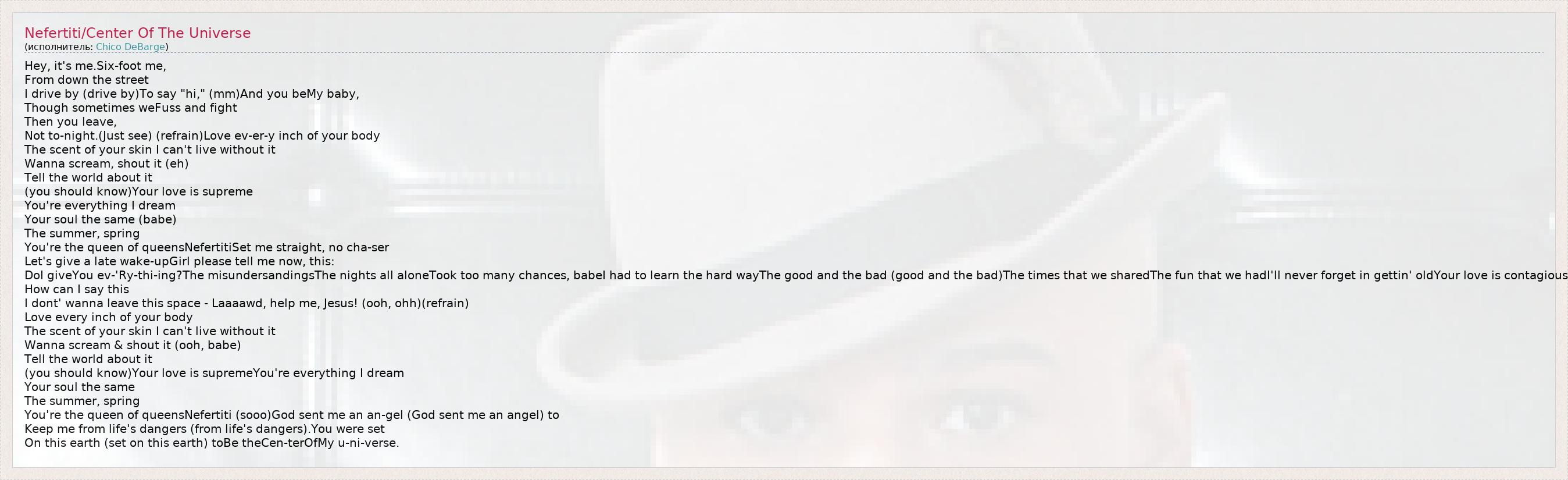 Hey, it's me.Six-foot me, From down the street I drive by (drive by)To say "hi," (mm)And you beMy baby, Though sometimes weFuss and fight Then you leave, Not to-night.(Just see) (refrain)Love ev-er-y inch of your body The scent of your skin I can't live without it Wanna scream, shout it (eh) Tell the world about it (you should know)Your love is supreme You're everything I dream Your soul the same (babe) The summer, spring You're the queen of queensNefertitiSet me straight, no cha-ser Let's give a late wake-upGirl please tell me now, this: DoI giveYou ev-'Ry-thi-ing?The misundersandingsThe nights all aloneTook too many chances, babeI had to learn the hard wayThe good and the bad (good and the bad)The times that we sharedThe fun that we hadI'll never forget in gettin' oldYour love is contagious How can I say this I dont' wanna leave this space - Laaaawd, help me, Jesus! (ooh, ohh)(refrain) Love every inch of your body The scent of your skin I can't live without it Wanna scream & shout it (ooh, babe) Tell the world about it (you should know)Your love is supremeYou're everything I dream Your soul the same The summer, spring You're the queen of queensNefertiti (sooo)God sent me an an-gel (God sent me an angel) to Keep me from life's dangers (from life's dangers).You were set On this earth (set on this earth) toBe theCen-terOfMy u-ni-verse.