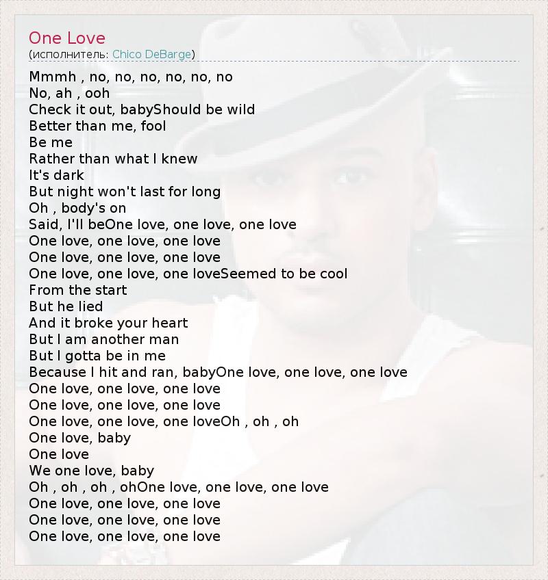 Mmmh , no, no, no, no, no, no No, ah , ooh Check it out, babyShould be wild Better than me, fool Be me Rather than what I knew It's dark But night won't last for long Oh , body's on Said, I'll beOne love, one love, one love One love, one love, one love One love, one love, one love One love, one love, one loveSeemed to be cool From the start But he lied And it broke your heart But I am another man But I gotta be in me Because I hit and ran, babyOne love, one love, one love One love, one love, one love One love, one love, one love One love, one love, one loveOh , oh , oh One love, baby One love We one love, baby Oh , oh , oh , ohOne love, one love, one love One love, one love, one love One love, one love, one love One love, one love, one love