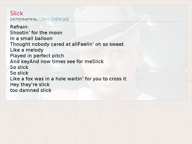 Refrain: Shootin' for the moon In a small balloon Thought nobody cared at allFeelin' oh so sweet Like a melody Played in perfect pitch And keyAnd now times see for meSlick So slick So slick Like a fox was in a hole waitin' for you to cross it Hey they're slick too damned slick