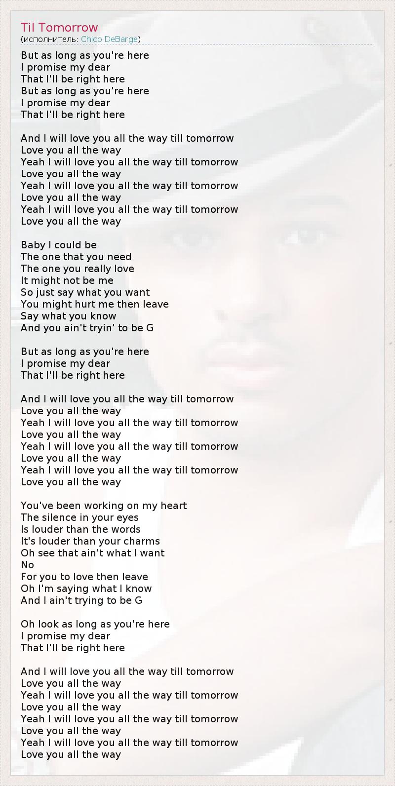 But as long as you're here I promise my dear That I'll be right here But as long as you're here I promise my dear That I'll be right here And I will love you all the way till tomorrow Love you all the way Yeah I will love you all the way till tomorrow Love you all the way Yeah I will love you all the way till tomorrow Love you all the way Yeah I will love you all the way till tomorrow Love you all the way Baby I could be The one that you need The one you really love It might not be me So just say what you want You might hurt me then leave Say what you know And you ain't tryin' to be G But as long as you're here I promise my dear That I'll be right here And I will love you all the way till tomorrow Love you all the way Yeah I will love you all the way till tomorrow Love you all the way Yeah I will love you all the way till tomorrow Love you all the way Yeah I will love you all the way till tomorrow Love you all the way You've been working on my heart The silence in your eyes Is louder than the words It's louder than your charms Oh see that ain't what I want No For you to love then leave Oh I'm saying what I know And I ain't trying to be G Oh look as long as you're here I promise my dear That I'll be right here And I will love you all the way till tomorrow Love you all the way Yeah I will love you all the way till tomorrow Love you all the way Yeah I will love you all the way till tomorrow Love you all the way Yeah I will love you all the way till tomorrow Love you all the way