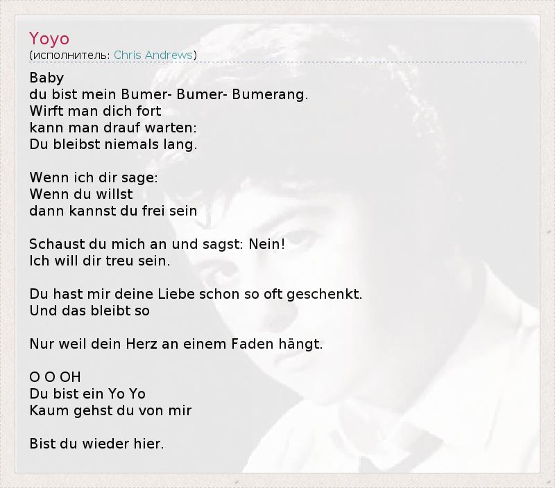 Baby du bist mein Bumer- Bumer- Bumerang. Wirft man dich fort kann man drauf warten: Du bleibst niemals lang. Wenn ich dir sage: Wenn du willst dann kannst du frei sein Schaust du mich an und sagst: Nein! Ich will dir treu sein. Du hast mir deine Liebe schon so oft geschenkt. Und das bleibt so Nur weil dein Herz an einem Faden hängt. O O OH Du bist ein Yo Yo Kaum gehst du von mir Bist du wieder hier.
