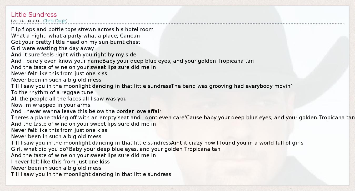 Flip flops and bottle tops strewn across his hotel room What a night, what a party what a place, Cancun Got your pretty little head on my sun burnt chest Girl were wasting the day away And it sure feels right with you right by my side And I barely even know your nameBaby your deep blue eyes, and your golden Tropicana tan And the taste of wine on your sweet lips sure did me in Never felt like this from just one kiss Never been in such a big old mess Till I saw you in the moonlight dancing in that little sundressThe band was grooving had everybody movin' To the rhythm of a reggae tune All the people all the faces all I saw was you Now Im wrapped in your arms And I never wanna leave this below the border love affair Theres a plane taking off with an empty seat and I dont even care'Cause baby your deep blue eyes, and your golden Tropicana tan And the taste of wine on your sweet lips sure did me in Never felt like this from just one kiss Never been in such a big old mess Till I saw you in the moonlight dancing in that little sundressAint it crazy how I found you in a world full of girls Girl, what did you do?Baby your deep blue eyes, and your golden Tropicana tan And the taste of wine on your sweet lips sure did me in I never felt like this from just one kiss Never been in such a big old mess Till I saw you in the moonlight dancing in that little sundress