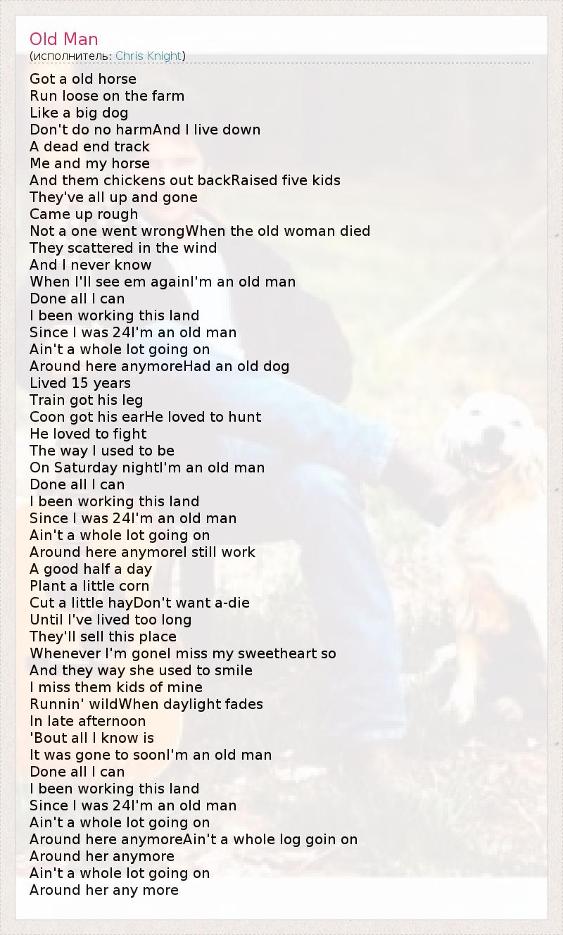 Got a old horse Run loose on the farm Like a big dog Don't do no harmAnd I live down A dead end track Me and my horse And them chickens out backRaised five kids They've all up and gone Came up rough Not a one went wrongWhen the old woman died They scattered in the wind And I never know When I'll see em againI'm an old man Done all I can I been working this land Since I was 24I'm an old man Ain't a whole lot going on Around here anymoreHad an old dog Lived 15 years Train got his leg Coon got his earHe loved to hunt He loved to fight The way I used to be On Saturday nightI'm an old man Done all I can I been working this land Since I was 24I'm an old man Ain't a whole lot going on Around here anymoreI still work A good half a day Plant a little corn Cut a little hayDon't want a-die Until I've lived too long They'll sell this place Whenever I'm goneI miss my sweetheart so And they way she used to smile I miss them kids of mine Runnin' wildWhen daylight fades In late afternoon 'Bout all I know is It was gone to soonI'm an old man Done all I can I been working this land Since I was 24I'm an old man Ain't a whole lot going on Around here anymoreAin't a whole log goin on Around her anymore Ain't a whole lot going on Around her any more