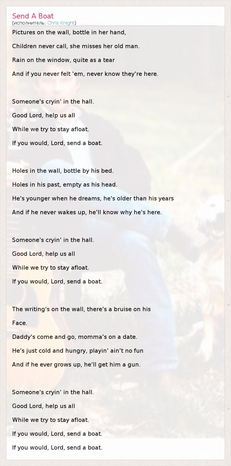 Pictures on the wall, bottle in her hand, Children never call, she misses her old man. Rain on the window, quite as a tear And if you never felt 'em, never know they're here. Someone's cryin' in the hall. Good Lord, help us all While we try to stay afloat. If you would, Lord, send a boat. Holes in the wall, bottle by his bed. Holes in his past, empty as his head. He's younger when he dreams, he's older than his years And if he never wakes up, he'll know why he's here. Someone's cryin' in the hall. Good Lord, help us all While we try to stay afloat. If you would, Lord, send a boat. The writing's on the wall, there's a bruise on his Face. Daddy's come and go, momma's on a date. He's just cold and hungry, playin' ain't no fun And if he ever grows up, he'll get him a gun. Someone's cryin' in the hall. Good Lord, help us all While we try to stay afloat. If you would, Lord, send a boat. If you would, Lord, send a boat.
