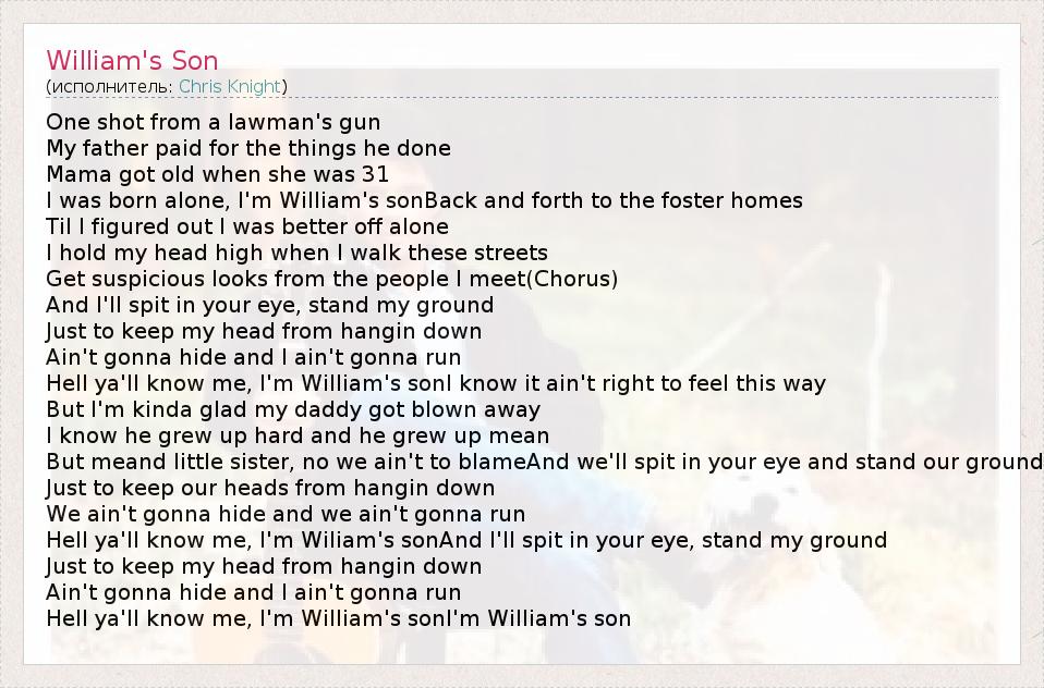 One shot from a lawman's gun My father paid for the things he done Mama got old when she was 31 I was born alone, I'm William's sonBack and forth to the foster homes Til I figured out I was better off alone I hold my head high when I walk these streets Get suspicious looks from the people I meet(Chorus) And I'll spit in your eye, stand my ground Just to keep my head from hangin down Ain't gonna hide and I ain't gonna run Hell ya'll know me, I'm William's sonI know it ain't right to feel this way But I'm kinda glad my daddy got blown away I know he grew up hard and he grew up mean But meand little sister, no we ain't to blameAnd we'll spit in your eye and stand our ground Just to keep our heads from hangin down We ain't gonna hide and we ain't gonna run Hell ya'll know me, I'm Wiliam's sonAnd I'll spit in your eye, stand my ground Just to keep my head from hangin down Ain't gonna hide and I ain't gonna run Hell ya'll know me, I'm William's sonI'm William's son