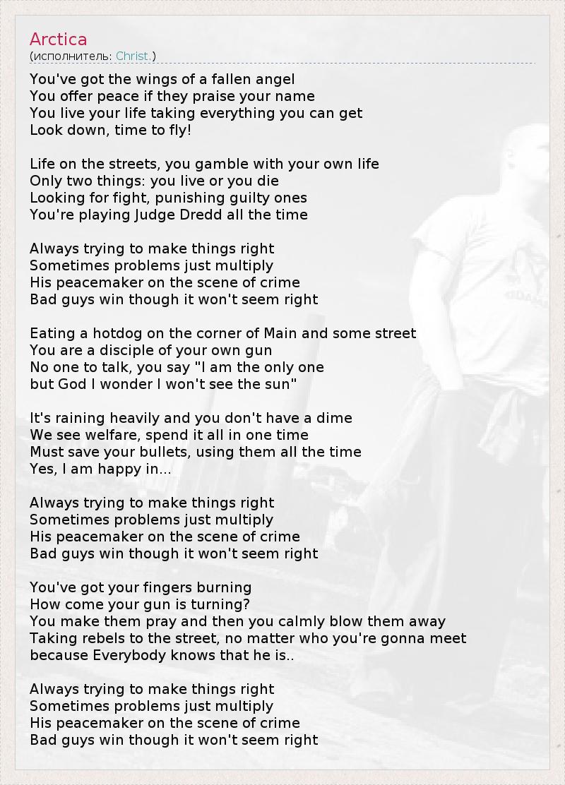Ты словно падший ангел, Ты даришь мир тем, кто славит тебя. Ты проживаешь жизнь, берешь все, что можешь взять. Взгляни вниз, тебе пора взлететь! Живешь на улице, ставишь на кон свою жизнь. Выбор один: живи или погибни. Ищешь драки, караешь виновных, Строишь из себя Судью Дредда, Пытаясь навести порядок, Но проблем становится все больше. Его "миротворец" 1 на месте преступления – Плохие парни побеждают, хоть это и кажется несправедливым. Перекусил хот-догом на углу Мэйн стрит. Ты – преданный ученик своего же револьвера. Не с кем поговорить, и ты говоришь "Я один в этом мире, Но, Господи, увижу ли я когда-нибудь свет?" Льет дождь, а у тебя ни гроша. Мы все видели, как целые состояния проматываются в один миг. А ты должен сберечь пули, они тебе всегда пригодятся. Да, но я счастлив Пытаясь навести порядок, Хотя проблем становится все больше. Его "миротворец" на месте преступления – Плохие парни побеждают, хоть это и кажется несправедливым. Что-то жжет твои пальцы. Как вышло, что твой револьвер дрожит? Ты заставляешь их молить о пощаде, а потом спокойно убиваешь. Вытаскиваешь бунтарей на улицы, не заботясь о том, кто может тебя увидеть. Потому что все знают, что он Пытается навести порядок, Но проблем становится все больше. Его "миротворец" на месте преступления – Плохие парни побеждают, хоть это и кажется нечестным. 1 - "Миротворец" - англ. Peacemaker - модель револьвера Colt Single Action Army, Colt .45