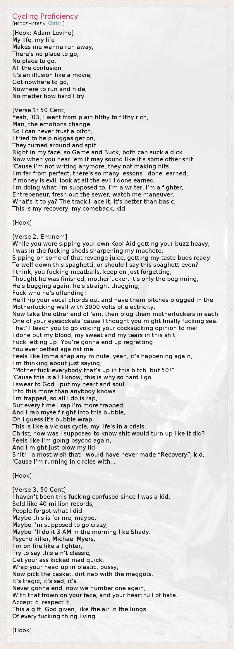 [Хук: Adam Levine] Моя жизнь, моя жизнь; Мне хочется сбежать от неё, Но скрыться негде, Негде спрятаться. Вся эта суета – Лишь обман, как в кино. Нет места, куда бы я мог уйти, Некуда бежать, негде спрятаться, Как бы я ни старался. [Куплет 1: 50 Cent] Да, в 2003 я превратился из обычного го**юка в богатого го**юка, Чувак, чувства переменчивы, Так что я никогда не смогу доверять су**ам, Я пытался помочь ниггерам подняться, Но они отвернулись от меня и плюнули Мне в лицо, так что, Гейм и Бак, 1 можете оба сосать х**! Их музыка теперь несколько х**овее: Я же больше не пишу для них – вот у них и кончились хиты. Я далёк от совершенства, но уже усвоил много уроков: Если деньги зло, то взгляните, сколько зла я натворил. Я делаю то, что от меня ждут: я сочинитель, я боец, Я бизнесмен, смотрите, как я, умело лавируя, поднялся из дерьма. Не нравится? Но я хотя бы не штампую свои песни; Пришла пора моего возрождения, моего возвращения, парень. [Хук] [Куплет 2: Eminem] Пока ты угрожал мне, попивая сок, Я затачивал мачете у себя в сарае, Готовя свои вкусовые рецепторы к утолению жажды мести, И пожирая ваши макароны, или лучше сказать мака-рожи? Что, б**, пельмени, всё ещё не припомните? Думали, что со мной уже покончено? Нет, у**ок, это только начало, Я снова неистовствую, живу по понятиям, И мне нас**ть на тех, на кого я раньше обижался. Я вырву вам голосовые связки, и подключу вас, уродов, К забору под напряжением в 3000 вольт. А потом присоединю другой электрод к глазам Каждого из вас, го**оны, чтобы вы, наконец, прозрели. Так вы научитесь выражать мне своё пи**рское мнение! Я вкладываю в свою музыку кровь, пот и слёзы, Распи**елись тут, петухи! Вы скоро пожалеете, Что вообще докапывались до меня. Я готов дать всем отпор в любое время, вот и сейчас Меня так и подмывает крикнуть: "Е**л я вас тут всех кроме Фифти!" Я могу жить только так, вот почему суров так я, Ей-богу, никто и не подозревает, сколько я отрываю от себя, Вкладывая в свои песни. Я в ловушке, поэтому мне только и остаётся, что читать рэп, Но как только я начинаю, я чувствую, что запутываюсь ещё больше, Я загнал себя им в непроницаемый пузырь, Думаю, он – от упаковочной плёнки. Это порочный круг, в моей жизни кризис, Господи, как, бл**ь, я мог знать, что всё вот так вот повернётся? Кажется, я опять съезжаю с катушек, Но я просто выпускал пар. С**а, я уже почти жалею, что вообще записал "Recovery", 2 Ведь теперь хождение по кругу это – ... [Хук] [Куплет 3: 50 Cent] Меня так не обижали с самого детства: Я продал где-то сорок миллионов альбомов, Но все об этом как-то позабыли. Может, такая у меня судьба, может быть, А может быть, я должен окончательно сбрендить, Может, я устрою резню в 3 часа ночи, как Шейди. 3 Я сумасшедший убийца, как Майкл Майерс, 4 Весь горю, как зажигалка; Хочешь сказать, что эта х**нь не станет классикой – Я быстро наваляю тебе, Суну твою башку в пластиковый пакет, слабак, А теперь выбирай себе гроб и отправляйся на корм червям. Печально и досадно, что Даже сейчас, когда мы вновь первые, злобные выражения лиц Не меняются, и ненависть не покидает ваших сердец. Примите это, уважайте это, Это дар Господень, как воздух, которым дышит Каждое живое существо. [Хук] 1 – Хип-хоп исполнители Game и Young Buck ранее были подписаны на лейбл 50 Cent'а G-Unit, но позднее со скандалом расторгли контракт. Конфликт перерос в песенное противостояние, так называемый "биф". 2 – Седьмой и на данный момент последний студ