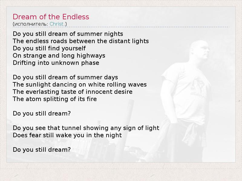 Тебе все еще снятся летние ночи, Бесконечные дороги меж отдаленных огней? Ты все еще оказываешься На незнакомых и длинных шоссе, Переходящих в нечто непонятное? Тебе все еще снятся летние дни, Солнечный свет, танцующий на белых качающихся волнах, Вечный вкус невинного желания, Пламя которого расщепляется на атомы? Ты все еще видишь сны? Ты видишь тот туннель хоть с какими-то признаками света? Страх все еще пробуждает тебя среди ночи? Ты все еще видишь сны?