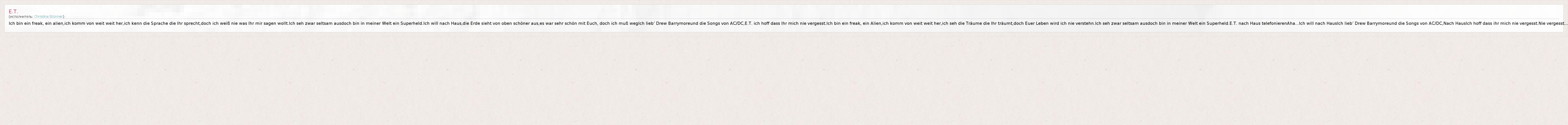 Ich bin ein freak, ein alien,ich komm von weit weit her,ich kenn die Sprache die Ihr sprecht,doch ich weiß nie was Ihr mir sagen wollt.Ich seh zwar seltsam ausdoch bin in meiner Welt ein Superheld.Ich will nach Haus,die Erde sieht von oben schöner aus,es war sehr schön mit Euch, doch ich muß wegIch lieb’ Drew Barrymoreund die Songs von AC/DC,E.T. ich hoff dass Ihr mich nie vergesst.Ich bin ein freak, ein Alien,ich komm von weit weit her,ich seh die Träume die Ihr träumt,doch Euer Leben wird ich nie verstehn.Ich seh zwar seltsam ausdoch bin in meiner Welt ein Superheld.E.T. nach Haus telefonierenAha...Ich will nach HausIch lieb’ Drew Barrymoreund die Songs von AC/DC,Nach HausIch hoff dass ihr mich nie vergesst.Nie vergesst...