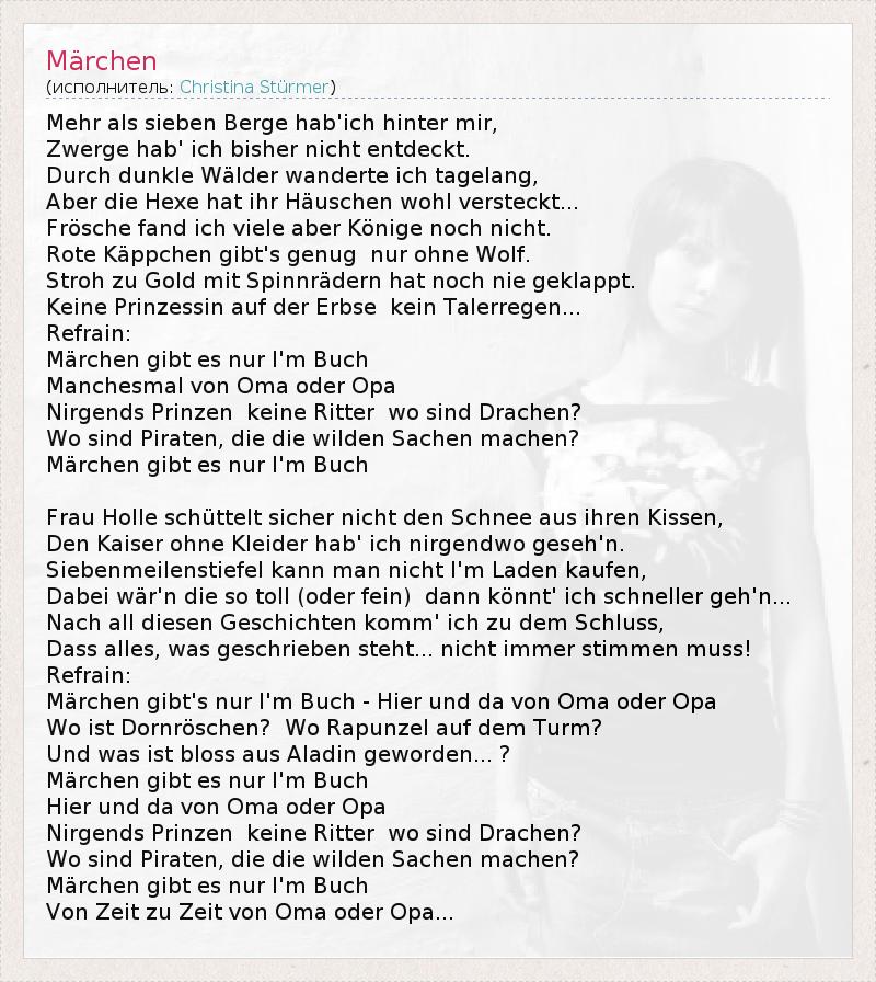 Mehr als sieben Berge hab'ich hinter mir, Zwerge hab' ich bisher nicht entdeckt. Durch dunkle Wälder wanderte ich tagelang, Aber die Hexe hat ihr Häuschen wohl versteckt... Frösche fand ich viele aber Könige noch nicht. Rote Käppchen gibt's genug nur ohne Wolf. Stroh zu Gold mit Spinnrädern hat noch nie geklappt. Keine Prinzessin auf der Erbse kein Talerregen... Refrain: Märchen gibt es nur I'm Buch Manchesmal von Oma oder Opa Nirgends Prinzen keine Ritter wo sind Drachen? Wo sind Piraten, die die wilden Sachen machen? Märchen gibt es nur I'm Buch Frau Holle schüttelt sicher nicht den Schnee aus ihren Kissen, Den Kaiser ohne Kleider hab' ich nirgendwo geseh'n. Siebenmeilenstiefel kann man nicht I'm Laden kaufen, Dabei wär'n die so toll (oder fein) dann könnt' ich schneller geh'n... Nach all diesen Geschichten komm' ich zu dem Schluss, Dass alles, was geschrieben steht... nicht immer stimmen muss! Refrain: Märchen gibt's nur I'm Buch - Hier und da von Oma oder Opa Wo ist Dornröschen? Wo Rapunzel auf dem Turm? Und was ist bloss aus Aladin geworden... ? Märchen gibt es nur I'm Buch Hier und da von Oma oder Opa Nirgends Prinzen keine Ritter wo sind Drachen? Wo sind Piraten, die die wilden Sachen machen? Märchen gibt es nur I'm Buch Von Zeit zu Zeit von Oma oder Opa...