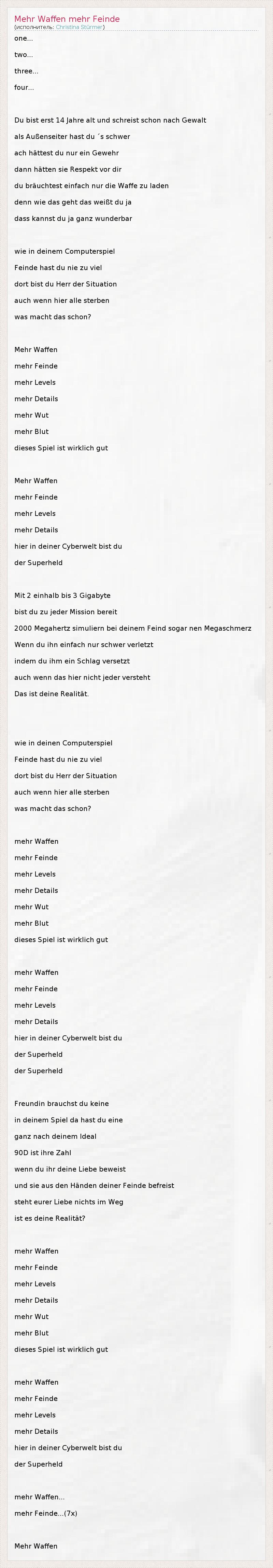 one... two... three... four... Du bist erst 14 Jahre alt und schreist schon nach Gewalt als Außenseiter hast du ´s schwer ach hättest du nur ein Gewehr dann hätten sie Respekt vor dir du bräuchtest einfach nur die Waffe zu laden denn wie das geht das weißt du ja dass kannst du ja ganz wunderbar wie in deinem Computerspiel Feinde hast du nie zu viel dort bist du Herr der Situation auch wenn hier alle sterben was macht das schon? Mehr Waffen mehr Feinde mehr Levels mehr Details mehr Wut mehr Blut dieses Spiel ist wirklich gut Mehr Waffen mehr Feinde mehr Levels mehr Details hier in deiner Cyberwelt bist du der Superheld Mit 2 einhalb bis 3 Gigabyte bist du zu jeder Mission bereit 2000 Megahertz simuliern bei deinem Feind sogar nen Megaschmerz Wenn du ihn einfach nur schwer verletzt indem du ihm ein Schlag versetzt auch wenn das hier nicht jeder versteht Das ist deine Realität. wie in deinen Computerspiel Feinde hast du nie zu viel dort bist du Herr der Situation auch wenn hier alle sterben was macht das schon? mehr Waffen mehr Feinde mehr Levels mehr Details mehr Wut mehr Blut dieses Spiel ist wirklich gut mehr Waffen mehr Feinde mehr Levels mehr Details hier in deiner Cyberwelt bist du der Superheld der Superheld Freundin brauchst du keine in deinem Spiel da hast du eine ganz nach deinem Ideal 90D ist ihre Zahl wenn du ihr deine Liebe beweist und sie aus den Händen deiner Feinde befreist steht eurer Liebe nichts im Weg ist es deine Realität? mehr Waffen mehr Feinde mehr Levels mehr Details mehr Wut mehr Blut dieses Spiel ist wirklich gut mehr Waffen mehr Feinde mehr Levels mehr Details hier in deiner Cyberwelt bist du der Superheld mehr Waffen... mehr Feinde...(7x) Mehr Waffen