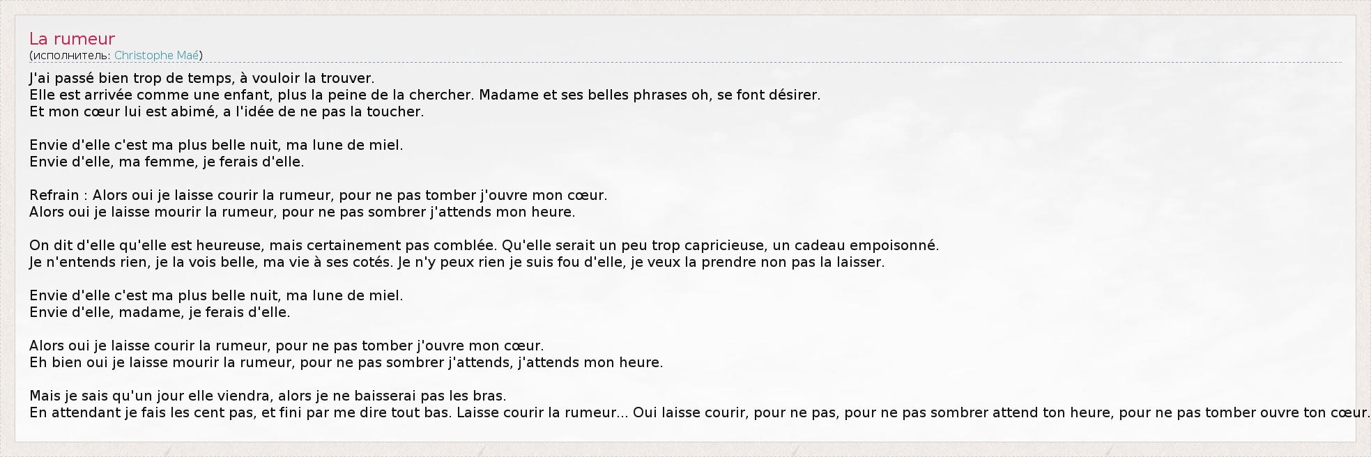 En attendant je fais les cent pas, et fini par me dire tout bas. Laisse courir la rumeur... Oui laisse courir, pour ne pas, pour ne pas sombrer attend ton heure, pour ne pas tomber ouvre ton cœur.
