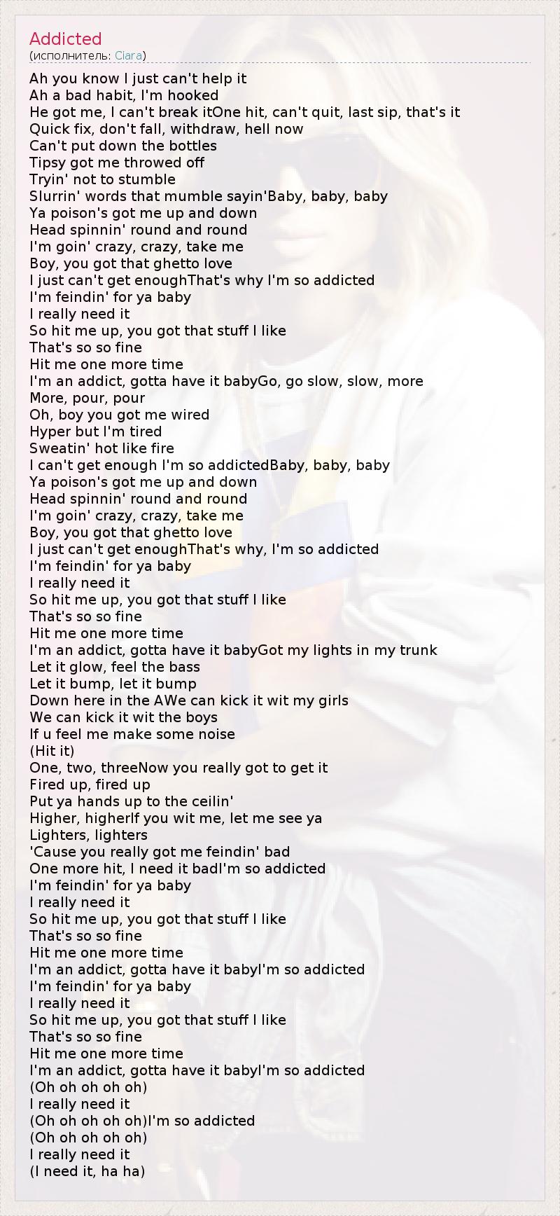 Ah you know I just can't help it Ah a bad habit, I'm hooked He got me, I can't break itOne hit, can't quit, last sip, that's it Quick fix, don't fall, withdraw, hell now Can't put down the bottles Tipsy got me throwed off Tryin' not to stumble Slurrin' words that mumble sayin'Baby, baby, baby Ya poison's got me up and down Head spinnin' round and round I'm goin' crazy, crazy, take me Boy, you got that ghetto love I just can't get enoughThat's why I'm so addicted I'm feindin' for ya baby I really need it So hit me up, you got that stuff I like That's so so fine Hit me one more time I'm an addict, gotta have it babyGo, go slow, slow, more More, pour, pour Oh, boy you got me wired Hyper but I'm tired Sweatin' hot like fire I can't get enough I'm so addictedBaby, baby, baby Ya poison's got me up and down Head spinnin' round and round I'm goin' crazy, crazy, take me Boy, you got that ghetto love I just can't get enoughThat's why, I'm so addicted I'm feindin' for ya baby I really need it So hit me up, you got that stuff I like That's so so fine Hit me one more time I'm an addict, gotta have it babyGot my lights in my trunk Let it glow, feel the bass Let it bump, let it bump Down here in the AWe can kick it wit my girls We can kick it wit the boys If u feel me make some noise (Hit it) One, two, threeNow you really got to get it Fired up, fired up Put ya hands up to the ceilin' Higher, higherIf you wit me, let me see ya Lighters, lighters 'Cause you really got me feindin' bad One more hit, I need it badI'm so addicted I'm feindin' for ya baby I really need it So hit me up, you got that stuff I like That's so so fine Hit me one more time I'm an addict, gotta have it babyI'm so addicted I'm feindin' for ya baby I really need it So hit me up, you got that stuff I like That's so so fine Hit me one more time I'm an addict, gotta have it babyI'm so addicted (Oh oh oh oh oh) I really need it (Oh oh oh oh oh)I'm so addicted (Oh oh oh oh oh) I really need it (I need it, ha ha)