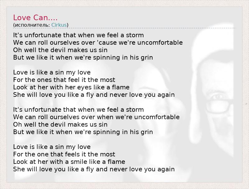 It's unfortunate that when we feel a storm We can roll ourselves over 'cause we're uncomfortable Oh well the devil makes us sin But we like it when we're spinning in his grin Love is like a sin my love For the ones that feel it the most Look at her with her eyes like a flame She will love you like a fly and never love you again It's unfortunate that when we feel a storm We can roll ourselves over when we're uncomfortable Oh well the devil makes us sin But we like it when we're spinning in his grin Love is like a sin my love For the one that feels it the most Look at her with a smile like a flame She will love you like a fly and never love you again