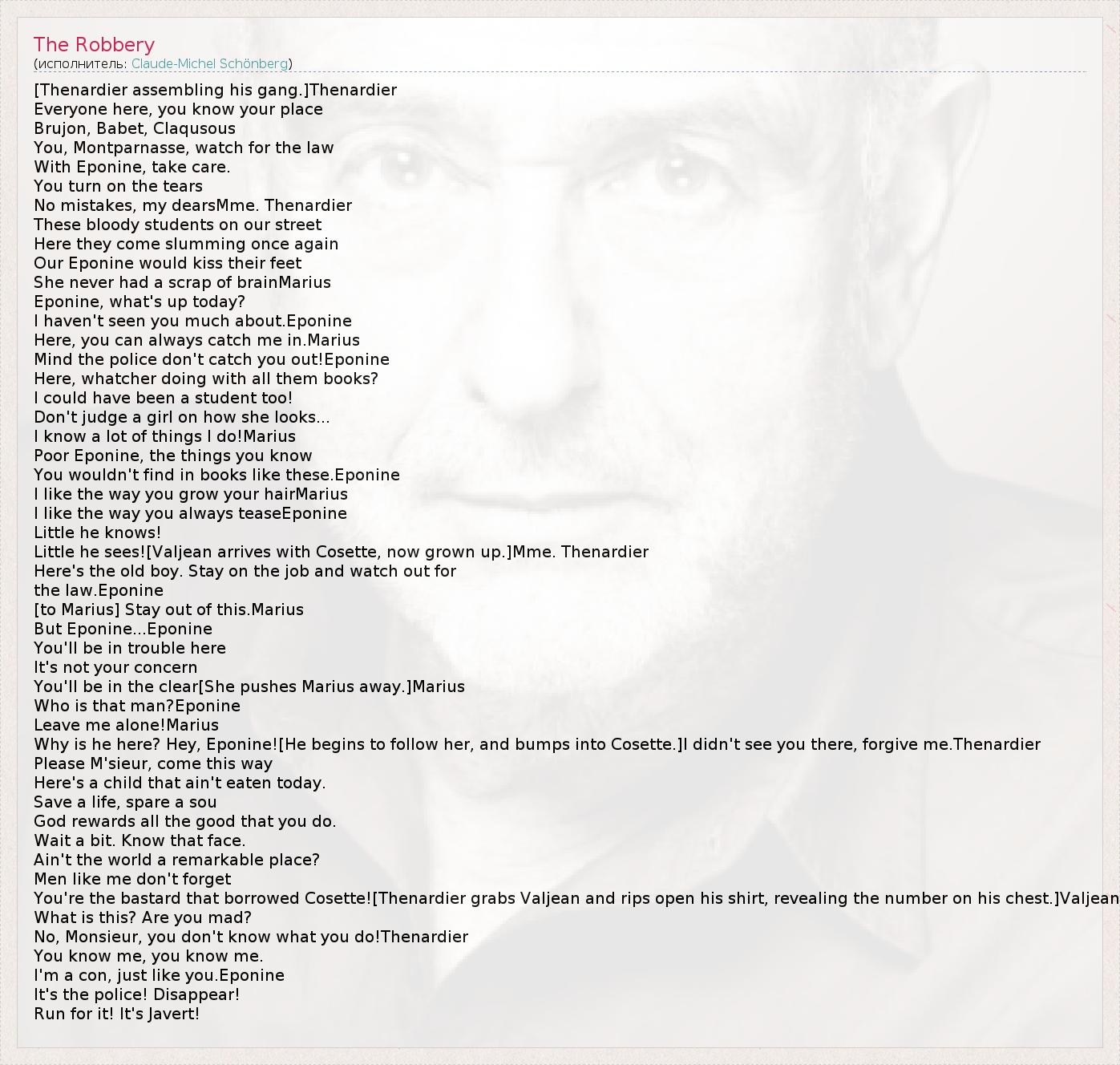You're the bastard that borrowed Cosette![Thenardier grabs Valjean and rips open his shirt, revealing the number on his chest.]Valjean