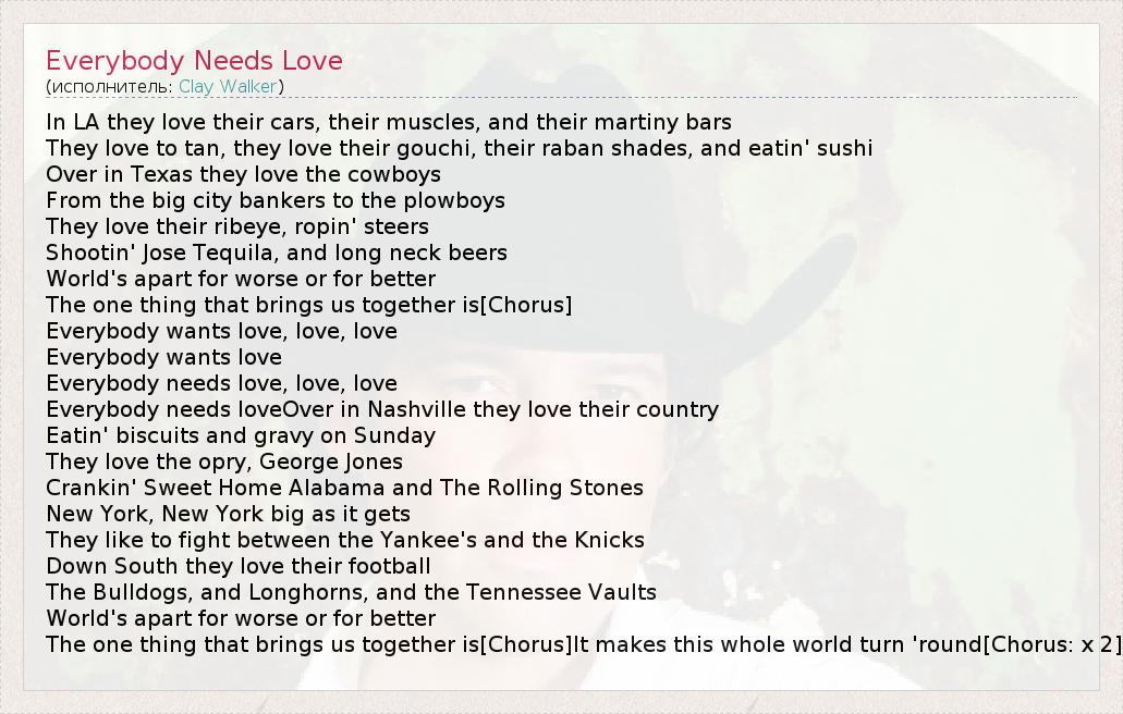 In LA they love their cars, their muscles, and their martiny bars They love to tan, they love their gouchi, their raban shades, and eatin' sushi Over in Texas they love the cowboys From the big city bankers to the plowboys They love their ribeye, ropin' steers Shootin' Jose Tequila, and long neck beers World's apart for worse or for better The one thing that brings us together is[Chorus] Everybody wants love, love, love Everybody wants love Everybody needs love, love, love Everybody needs loveOver in Nashville they love their country Eatin' biscuits and gravy on Sunday They love the opry, George Jones Crankin' Sweet Home Alabama and The Rolling Stones New York, New York big as it gets They like to fight between the Yankee's and the Knicks Down South they love their football The Bulldogs, and Longhorns, and the Tennessee Vaults World's apart for worse or for better The one thing that brings us together is[Chorus]It makes this whole world turn 'round[Chorus: x 2]
