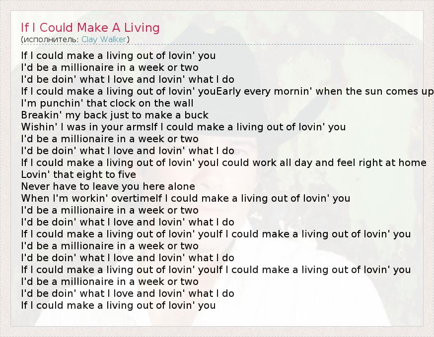 If I could make a living out of lovin' you I'd be a millionaire in a week or two I'd be doin' what I love and lovin' what I do If I could make a living out of lovin' youEarly every mornin' when the sun comes up I'm punchin' that clock on the wall Breakin' my back just to make a buck Wishin' I was in your armsIf I could make a living out of lovin' you I'd be a millionaire in a week or two I'd be doin' what I love and lovin' what I do If I could make a living out of lovin' youI could work all day and feel right at home Lovin' that eight to five Never have to leave you here alone When I'm workin' overtimeIf I could make a living out of lovin' you I'd be a millionaire in a week or two I'd be doin' what I love and lovin' what I do If I could make a living out of lovin' youIf I could make a living out of lovin' you I'd be a millionaire in a week or two I'd be doin' what I love and lovin' what I do If I could make a living out of lovin' youIf I could make a living out of lovin' you I'd be a millionaire in a week or two I'd be doin' what I love and lovin' what I do If I could make a living out of lovin' you