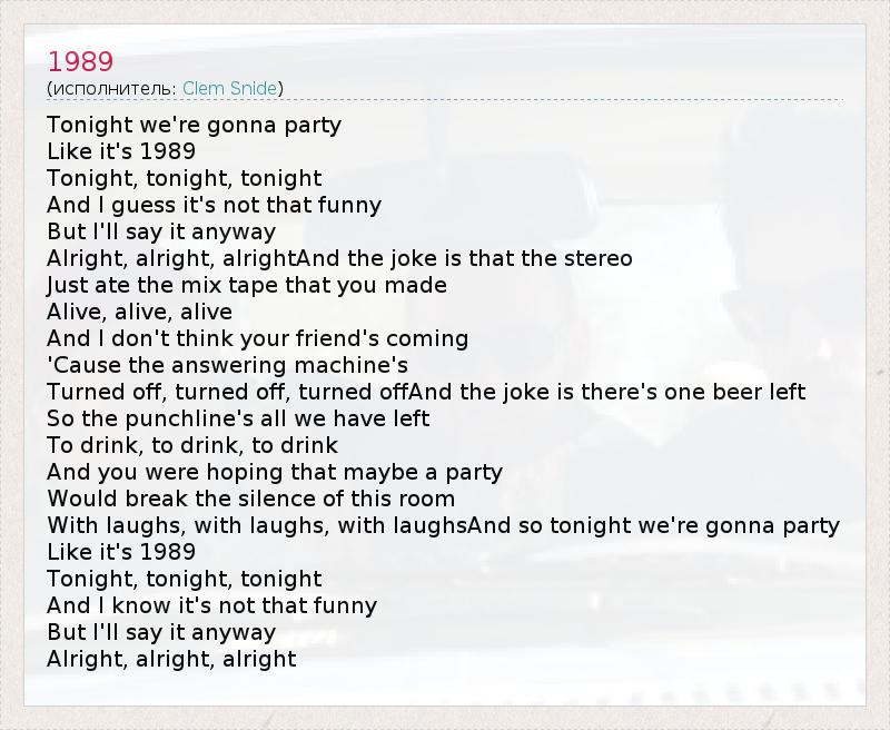 Tonight we're gonna party Like it's 1989 Tonight, tonight, tonight And I guess it's not that funny But I'll say it anyway Alright, alright, alrightAnd the joke is that the stereo Just ate the mix tape that you made Alive, alive, alive And I don't think your friend's coming 'Cause the answering machine's Turned off, turned off, turned offAnd the joke is there's one beer left So the punchline's all we have left To drink, to drink, to drink And you were hoping that maybe a party Would break the silence of this room With laughs, with laughs, with laughsAnd so tonight we're gonna party Like it's 1989 Tonight, tonight, tonight And I know it's not that funny But I'll say it anyway Alright, alright, alright